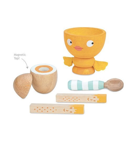 The chicky-chick set features a wooden egg cup (made of solid rubberwood and finished in water-based colours), hand stitched felt wings, a wooden egg with magnetic top, two hand painted 'soldiers' and a painted wooden spoon. This 6 piece set is full of play value ans is a fun addition to the honeybake role play collection. Children can serve up breakfast to their dolls and friends with this set. All Le Toy Van toys are designed in the UK and ethically produced in Indonesia using responsible sources.