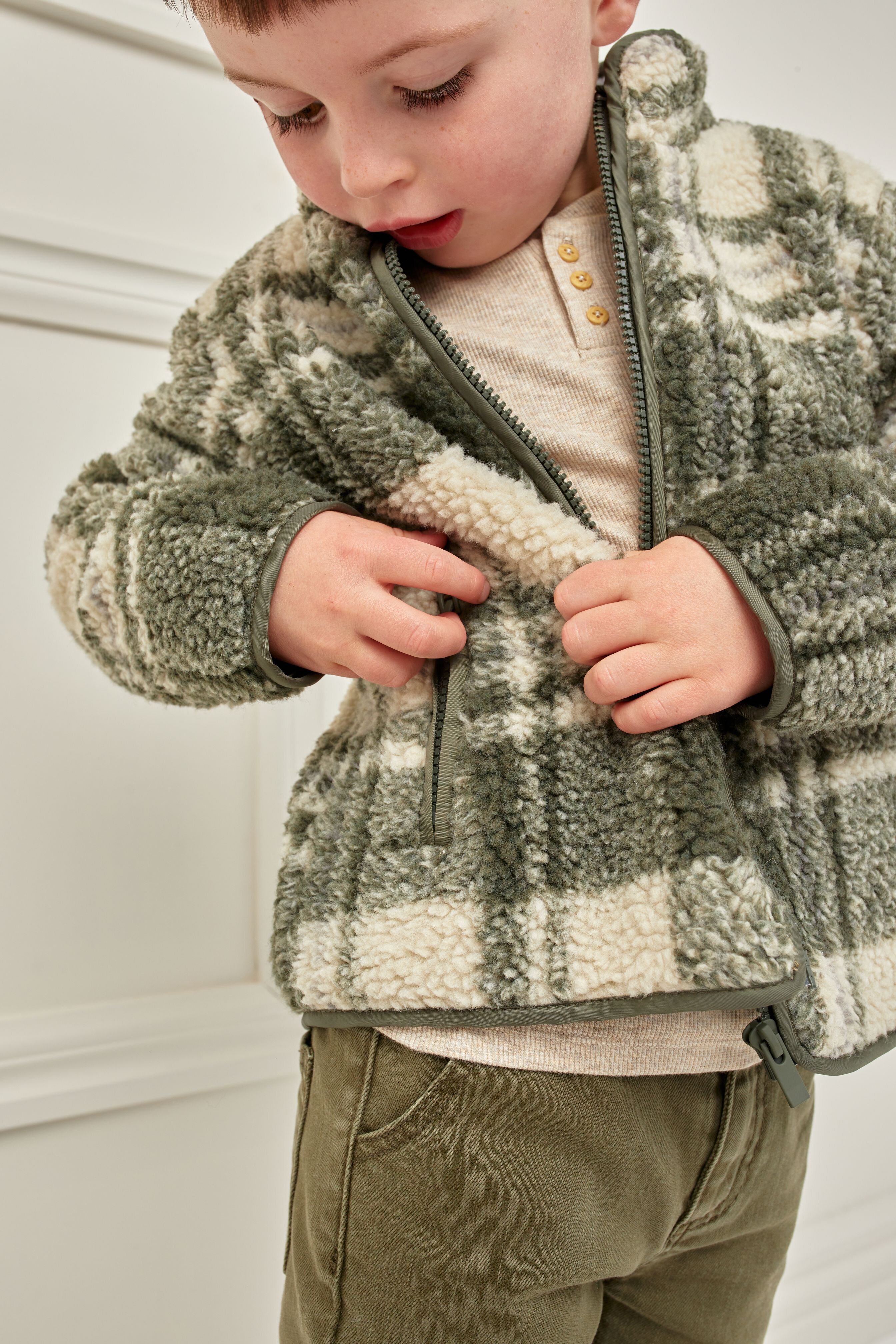 Milky Clothing Check Sherpa Jacket. This luxe jacket is a must have for those cold winter days. With centre front opening and high collar for warmth, avoid the cold and snuggle them up. Size & Fit- • Regular fit • Centre front green zip • Collar for warmth • Front functioning pockets • Green contrast bind • Length: 37cm (Size 2) 42cm (Size 4) 52cm (Size 8) Material & Care- 100% Polyester- Body ad Lining Uroff-white & cream check sherpa with green contrast bind Cold Hand Wash, fasten all closures before washingAustralian designed children's fashion label MILKY combines the perfect mix of edgy, irresistible clothing, a refreshing colour palette and on trend styling. MILKY has the must have items for little one's, at great pricing.Come and check out the range at Kid Republic stores.