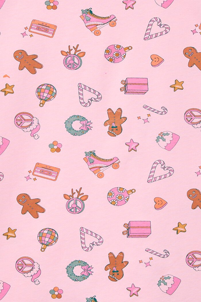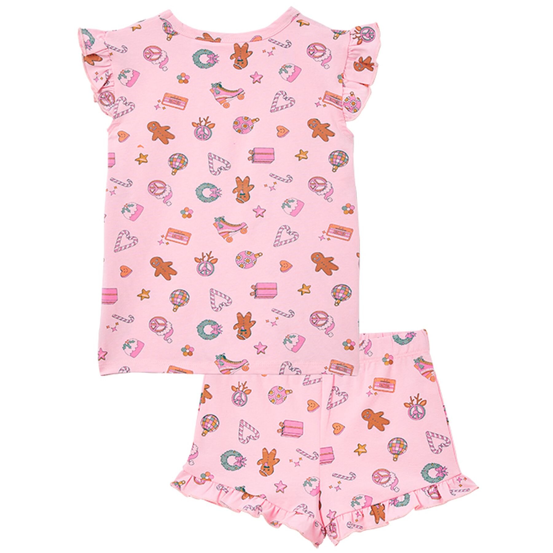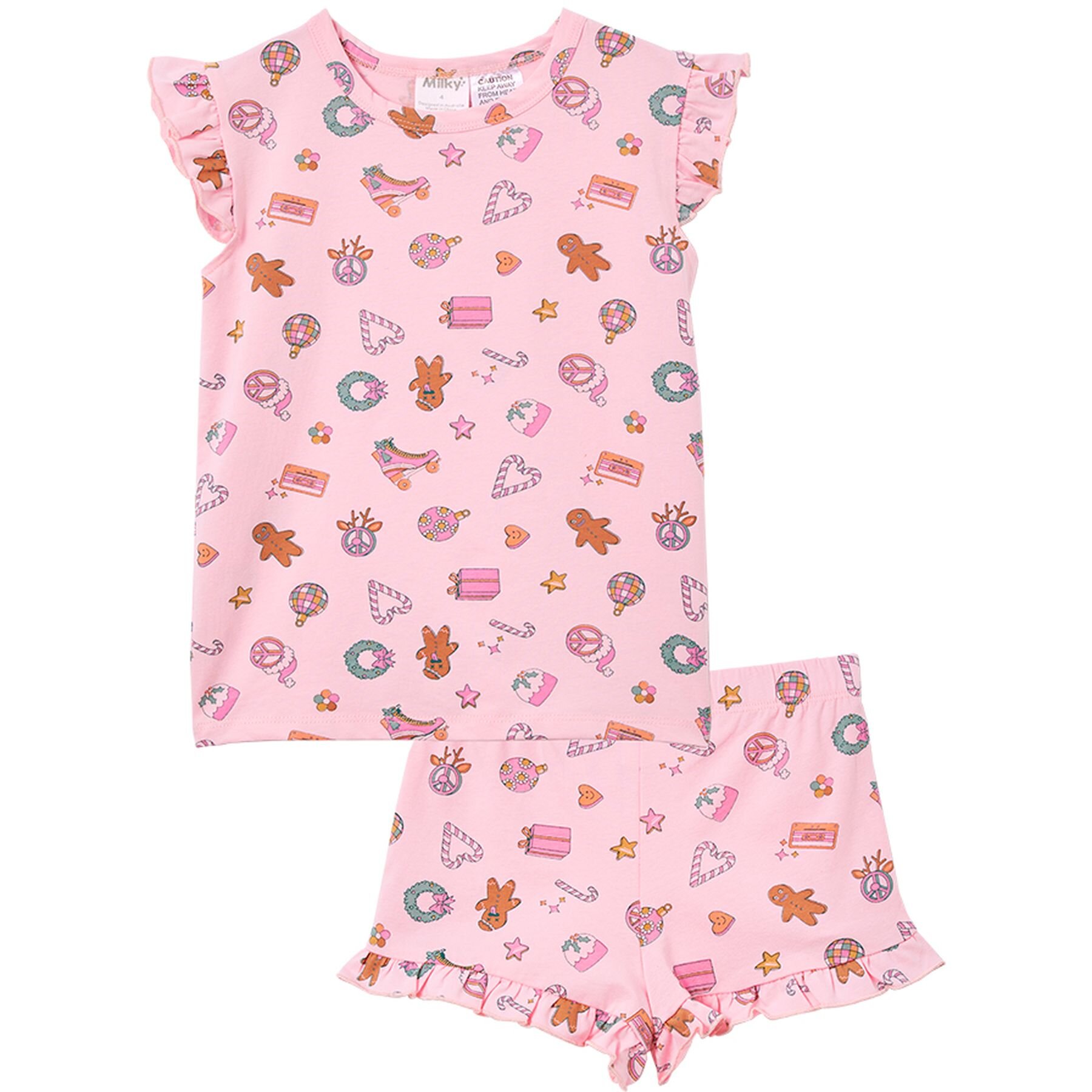 Milky Clothing Festive PJs. As we approach the festive season you can look no further than these PJs! Made from super soft cotton elastane that's hard-wearing they will retain their shape wash after wash. These PJs are a short and cap sleeved tee combo on a powder pink base, with an all-over cheeky festive print.