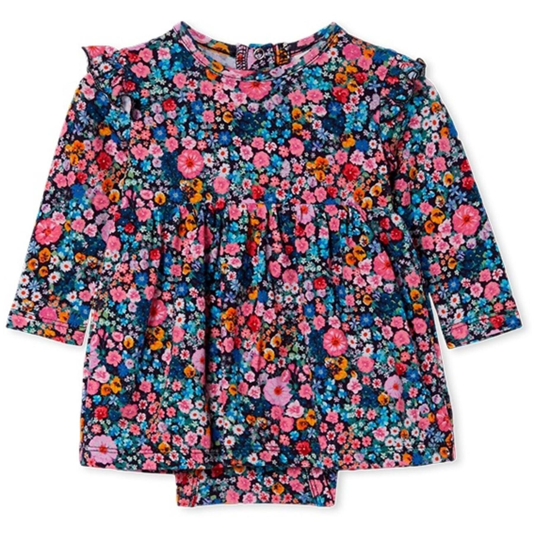 Milky Clothing Garden baby dress is such a sweet way to brighten your baby girls winter wardrobe.  Featuring a gathered waistline with flare skirt and snaps at the crotch for easy changing