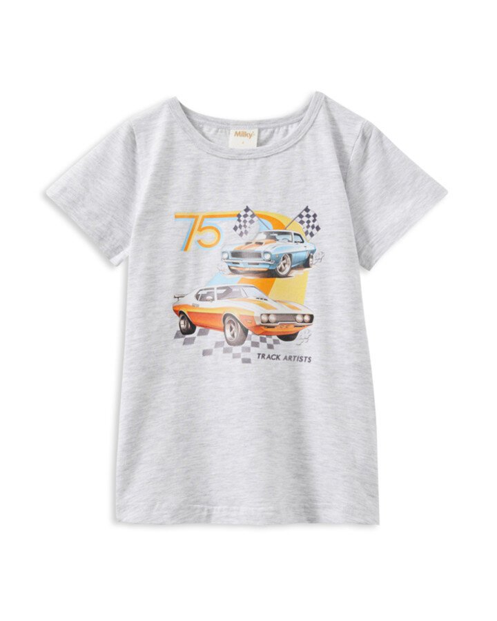 Rev up your little one's wardrobe with the Milky Clothing Grand Prix Tee, a playful yet practical piece that's sure to be a favorite. Featuring a bold centre front graphic on a soft silver marle base, this tee brings a sense of fun and energy to any casual outfit. Inspired by the thrill of the race, the Grand Prix print adds a touch of adventure to your child's day, making it perfect for playtime, outings, or simply lounging around.