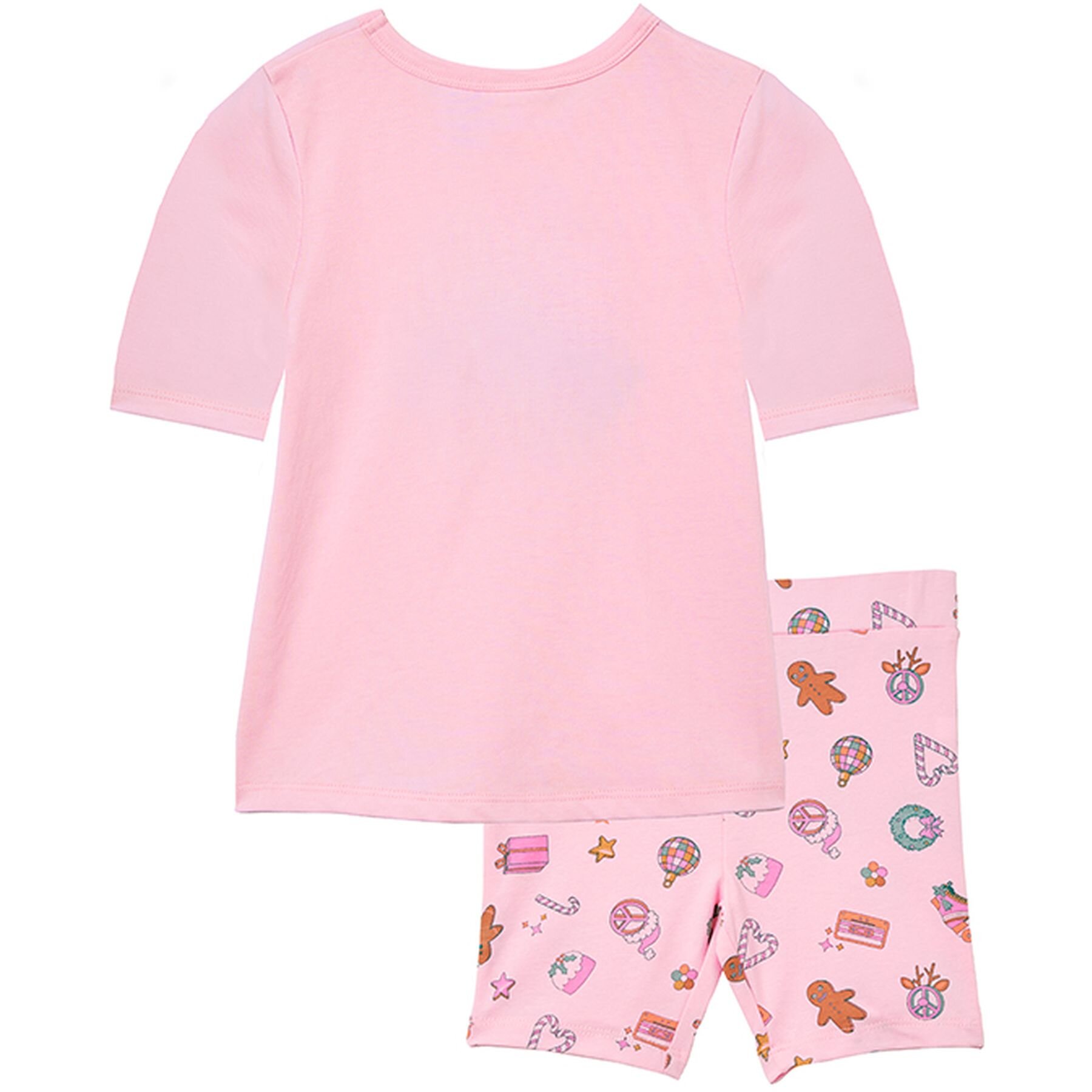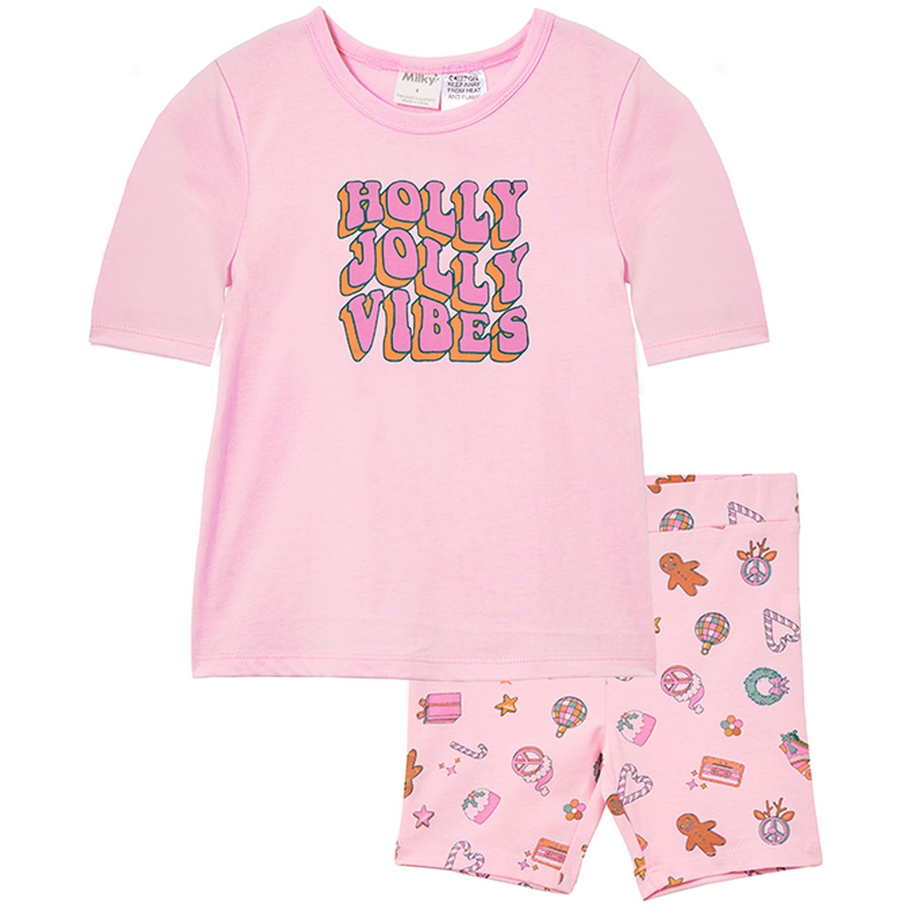 Milky Clothing Holly Jolly PJs. As we approach the festive season you can look no further than these Christmas PJs! Made from super soft cotton elastane that's hard-wearing it will retain its shape wash after wash. These PJs are a bike short and tee combo on a powder pink base, the short with an all-over cheeky festive print while the tee has a chest print front and centre.