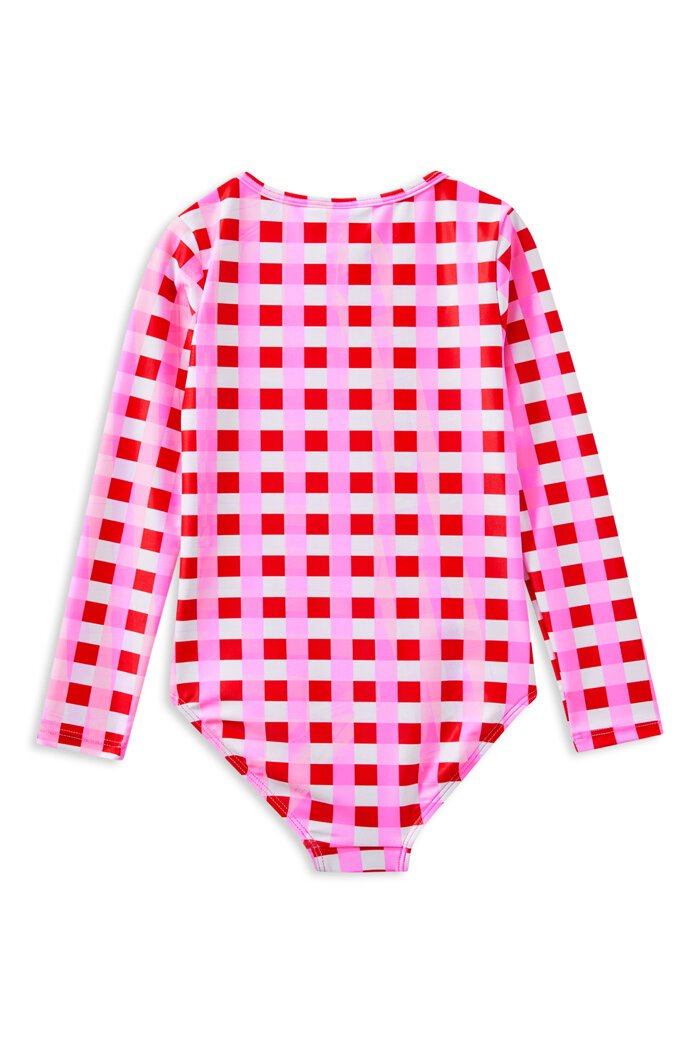 Milky Clothing Lollipop Check Long Sleeve Swimsuit. Make a splash in style with our pink and red Lollipop Check Long Sleeve Swimsuit. This swimsuit is designed to keep your little one sun-safe and swim ready. With full length sleeves and a UPF 50+ rating, it's perfect for long days at the beach or by the pool.
