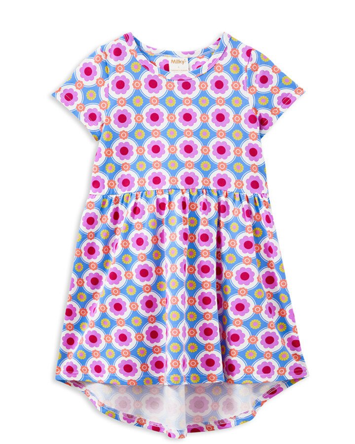 Milky Clothing Retro Vibe Dress is the ultimate everyday staple for colour-loving kids. Crafted from soft, stretchy cotton jersey, this easy-to-wear style pops with a bold, retro-inspired floral print in vibrant shades of pink, red and blue. Designed for all-day comfort, it features a classic round neckline, gathered waist and straight hemline - perfect for daycare, weekend play, or family outings. Just slip it on and go!