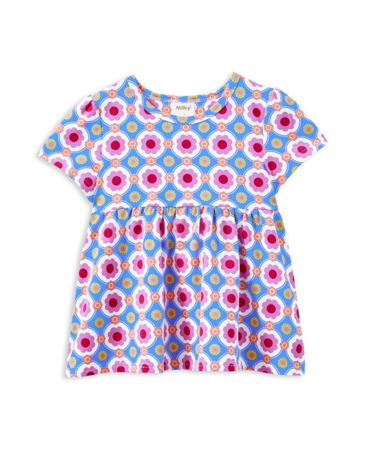 Milky Clothing Retro Vibe Swing Tee is the perfect fun and flowing addition to your little one's wardrobe. Crafted from a soft cotton-rich blend, this sweet tee features a fun retro print. With short sleeves and a gathered waistline, it offers a flattering, airy fit that's perfect for twirling. Pair it with the matching Retro Vibe Bike Shorts for a coordinated, trendy look, or team it with your favorite shorts or leggings for a breezy, effortless style. This versatile tee is sure to keep your little one both stylish and comfortable all day long.