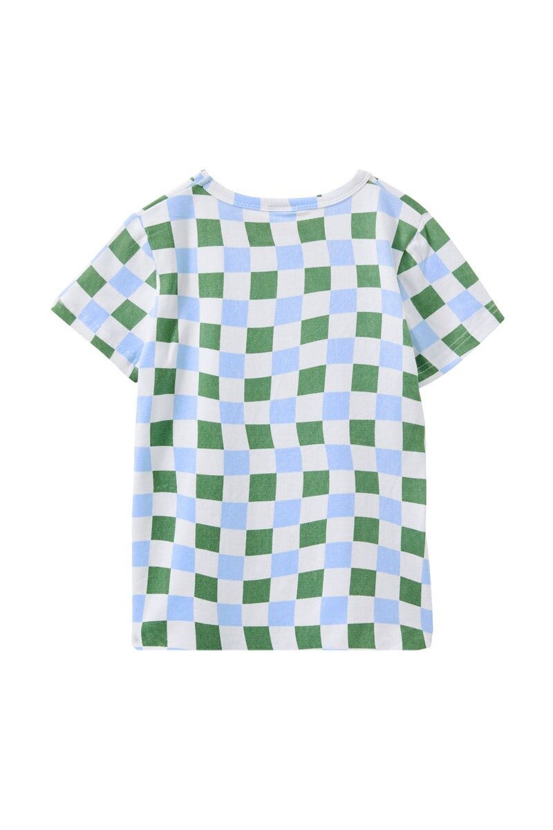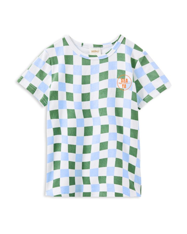 Milky Clothing Sea Ya Tee is the perfect blend of style, comfort, and versatility an essential addition to your little one s summer wardrobe. This cool short-sleeve t-shirt is designed to keep him looking sharp and feeling comfortable all day long, whether he's enjoying outdoor adventures or relaxing at home. The off-white base is beautifully complemented by a playful green and blue abstract check print, adding a fun, modern touch to his look. Crafted from soft, breathable fabric, this tee ensures he stays cool and comfortable while effortlessly standing out in style. A must-have for any summer wardrobe!