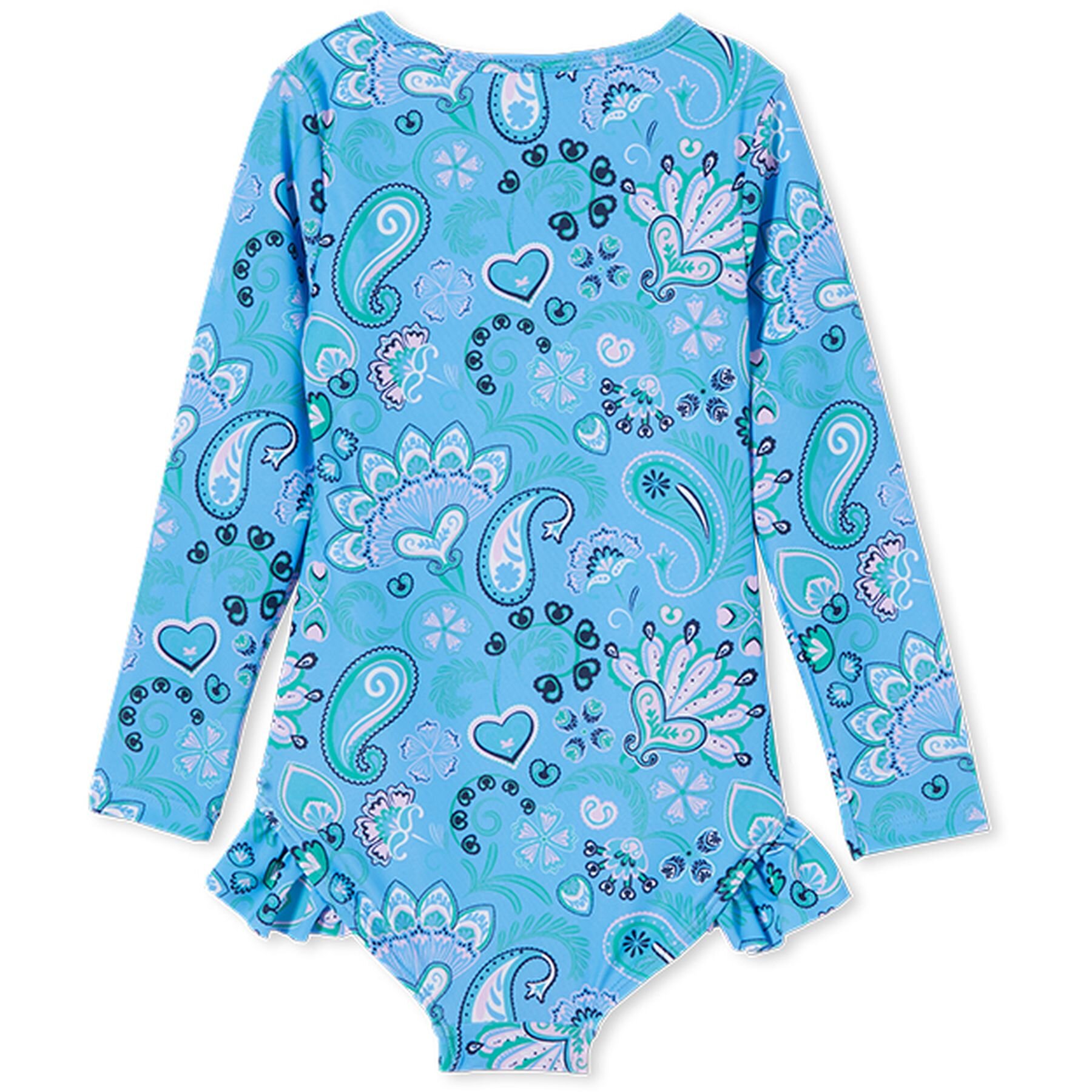 Milky Summer Long Sleeve Swimsuit. Keep the sun off their skin and the wind from their shoulders in this Long Sleeve Swimsuit with UPF rating. The gorgeous summer print in tones of blue with highlights of mint and lilac will have you ready for a day in water. Complete the look with our Summer Swim Hat and stay sun smart this Summer with Milky Clothing.