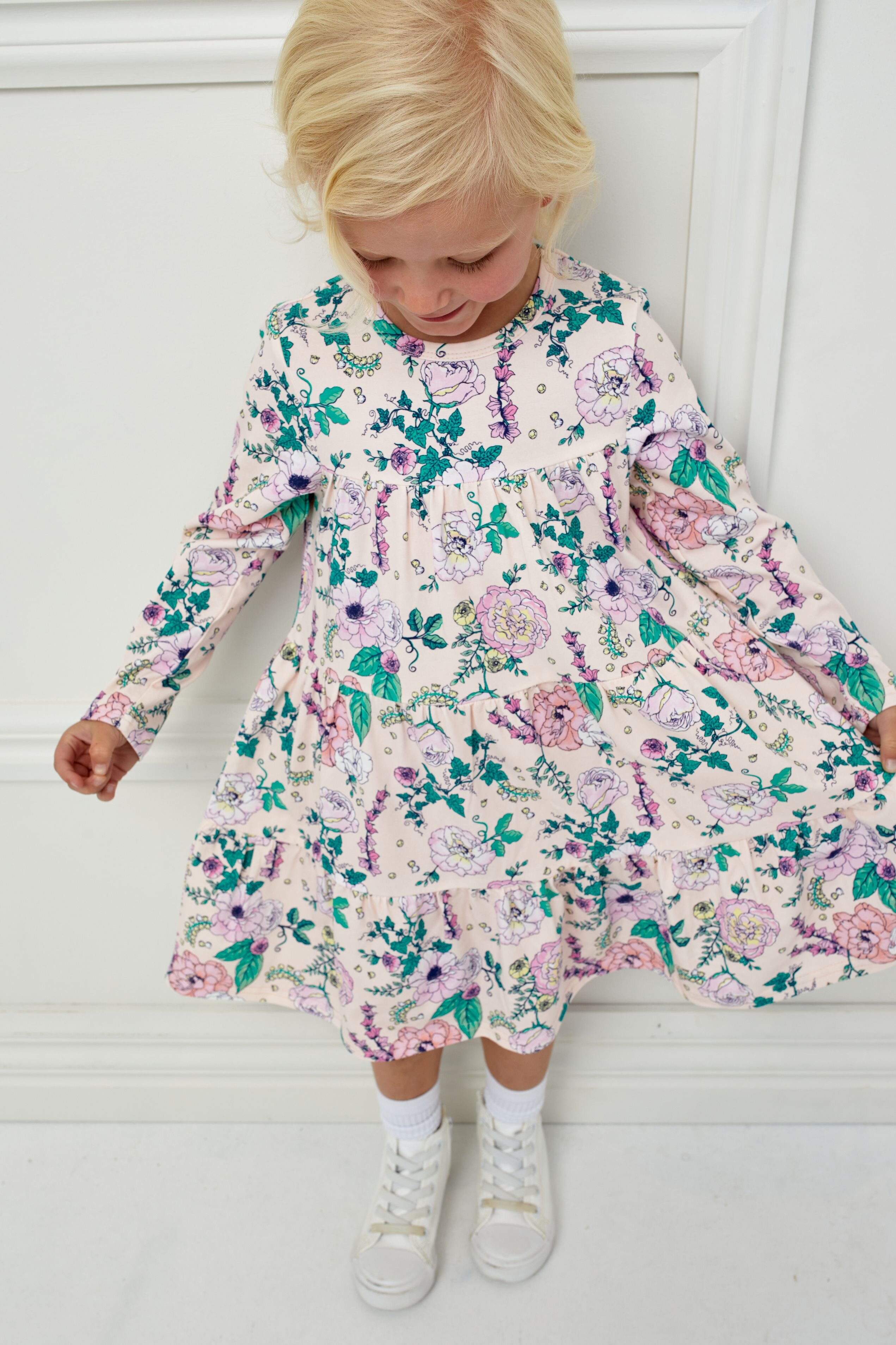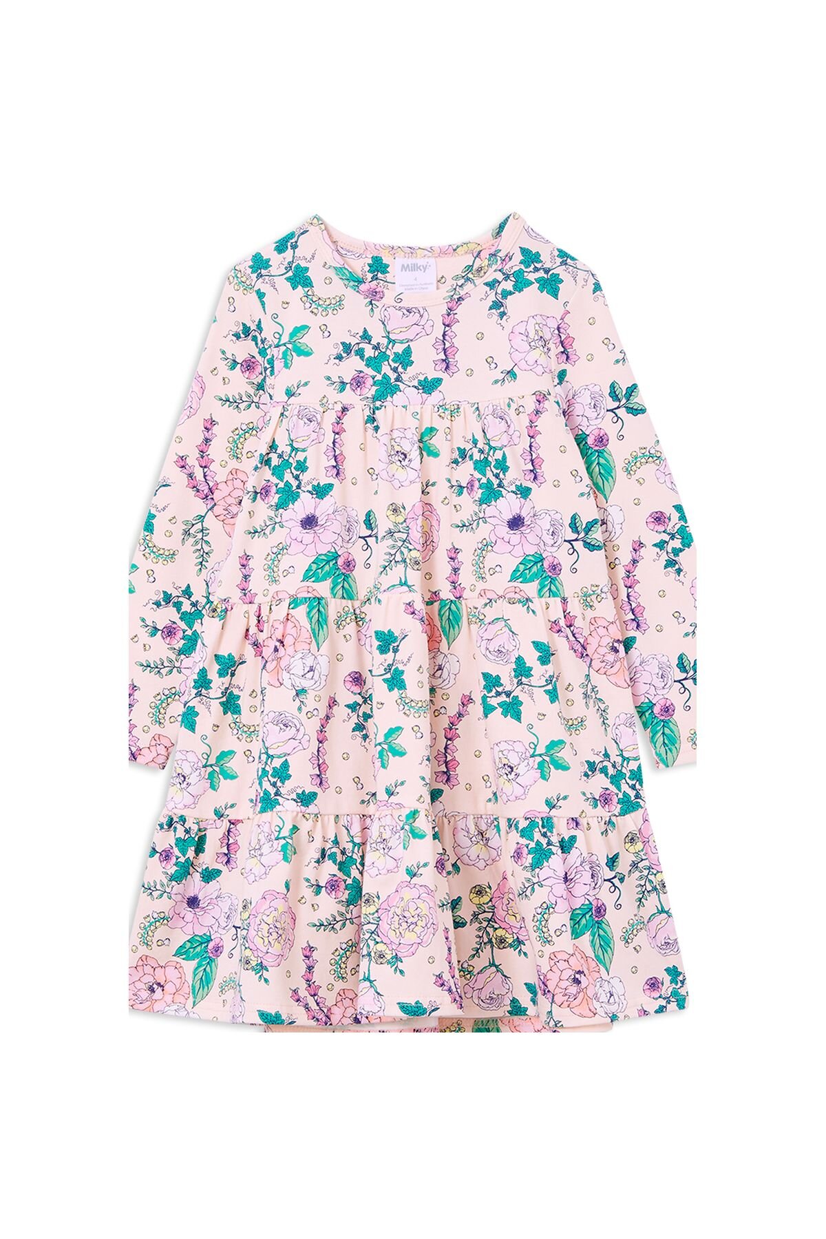 Milky Clothing Whimsical Tiered Dress. This girl’s long-sleeved dress will fast become one of her favourite winter items. This dress has long sleeves and three gathered tiers. It's both fashionable and comfortable. Size & Fit- • Regular fit • Long sleeve dress • Dusty pink base with floral print • Dress with three Gathered tiers • Length: 54cm (Size 2), 61cm (Size 4), 75cm (Size 8) Material & Care- 95% Cotton / 5% Elastane Durable stretch jersey Cold Machine Wash.Australian designed children's fashion label MILKY combines the perfect mix of edgy, irresistible clothing, a refreshing colour palette and on trend styling. MILKY has the must have items for little one's, at great pricing.Come and check out the range at Kid Republic stores.