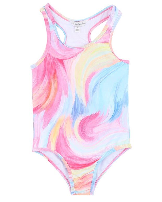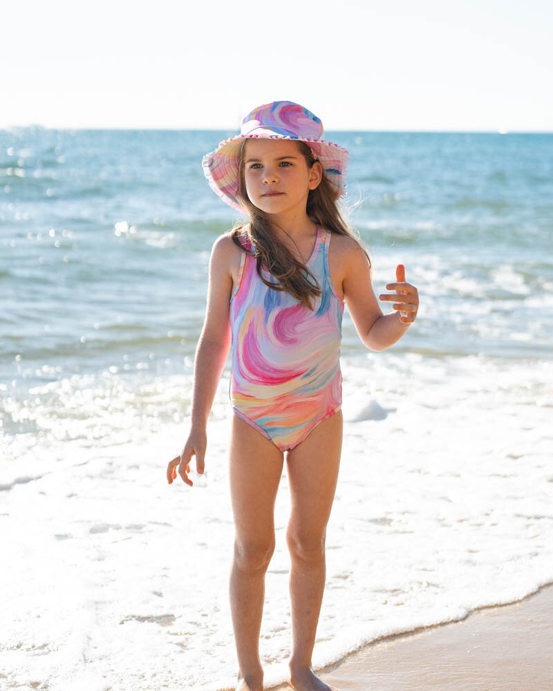 Dive into colour with this vibrant one-piece swimsuit, featuring our dreamy swirl print in a mix of candy pinks, soft blues and sunny yellow tones. Fully lined for comfort and designed with a sporty racerback and cut-out detail, it's perfect for active beach days and poolside play. Pair it with the matching swirl swim hat for a coordinated look.