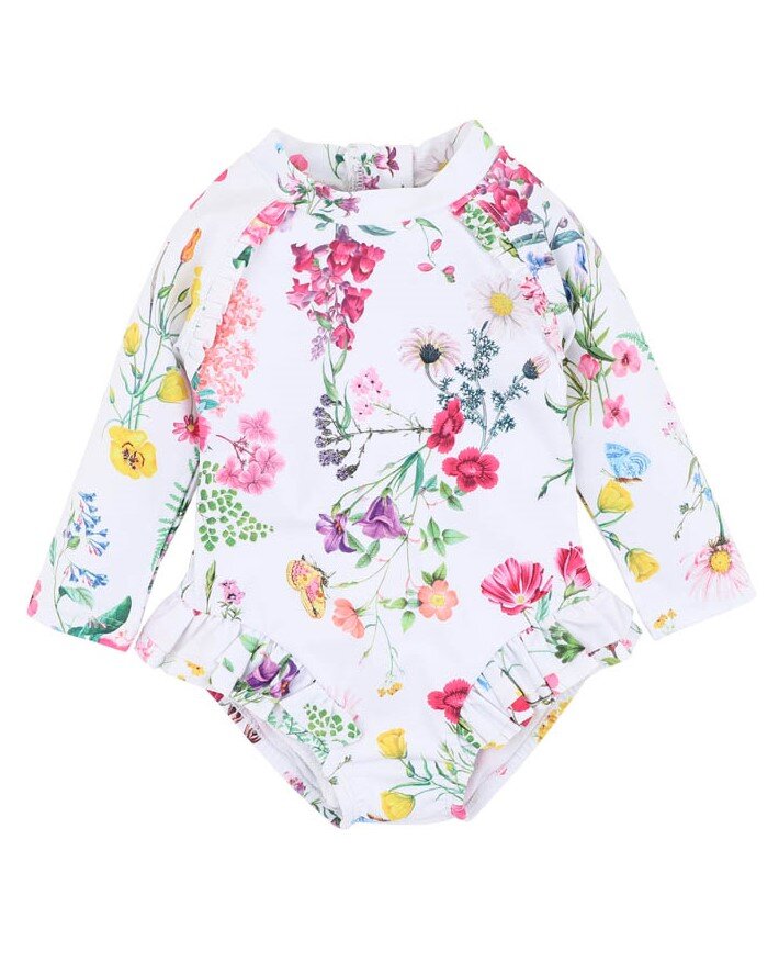 A sweet little piece for long sunny days splashing in the water, our Floral Garden print swim sunsuit combines pretty style with practical comfort. The soft frill details add a playful touch while the built-in detachable aqua nappy offers easy wear for your littlest swimmers.