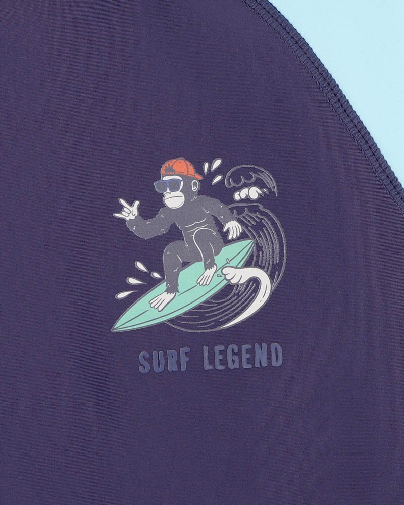 For little legends who live for sun and surf, this bold long sleeve rash top is ready for wave-catching adventures. Featuring a playful "Surf Legend" monkey graphic on a colour-blocked navy, orange and aqua base, it brings a burst of fun to every beach day.