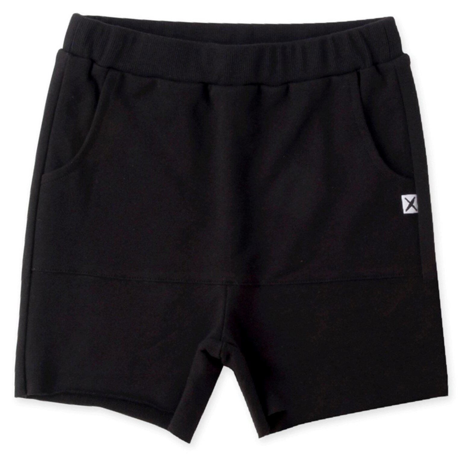 Super soft and comfy shorts with elastic waistband, raw cut off hem edge and front pouch pocket. Contrast embroidery on the back.