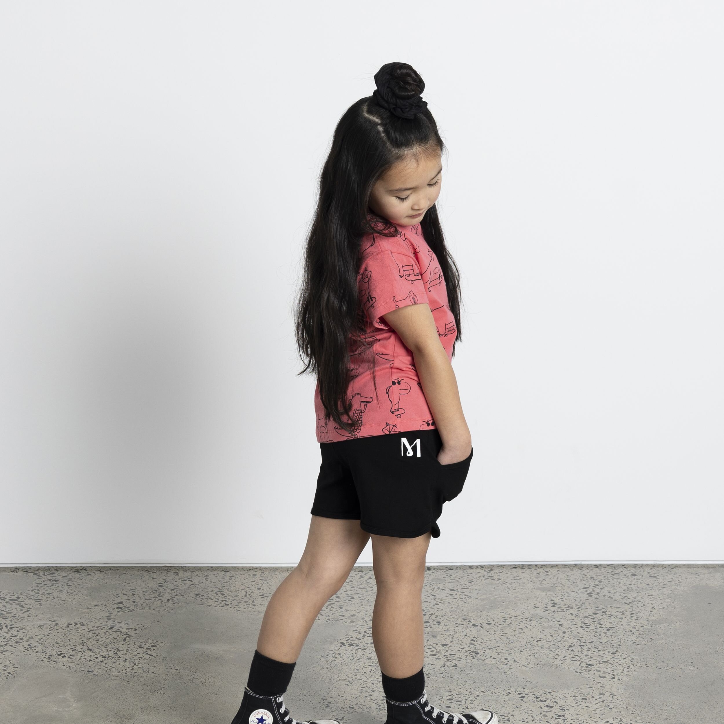 Tshirting weight shorts with elastic waist, front pockets and self rib rounded hem. Small Minti print on the back. 95% Cotton // 5% Elastane.