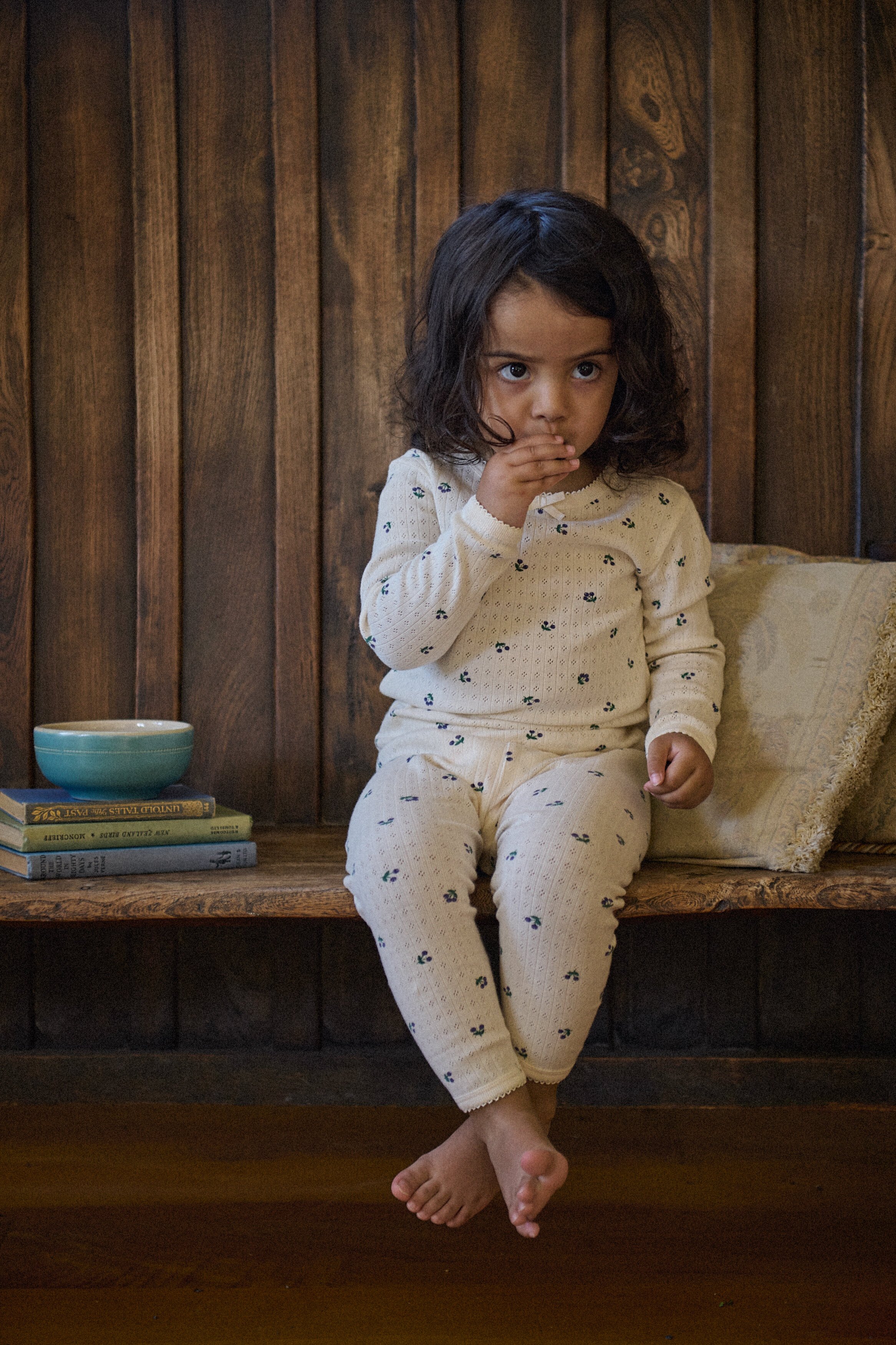 Keep little one cosy through cool winter nights with our 2 piece Long Sleeve Pointelle Pyjama Set. Made from beautiful pointelle cotton with a crew neck style top and elastic waist long pants.