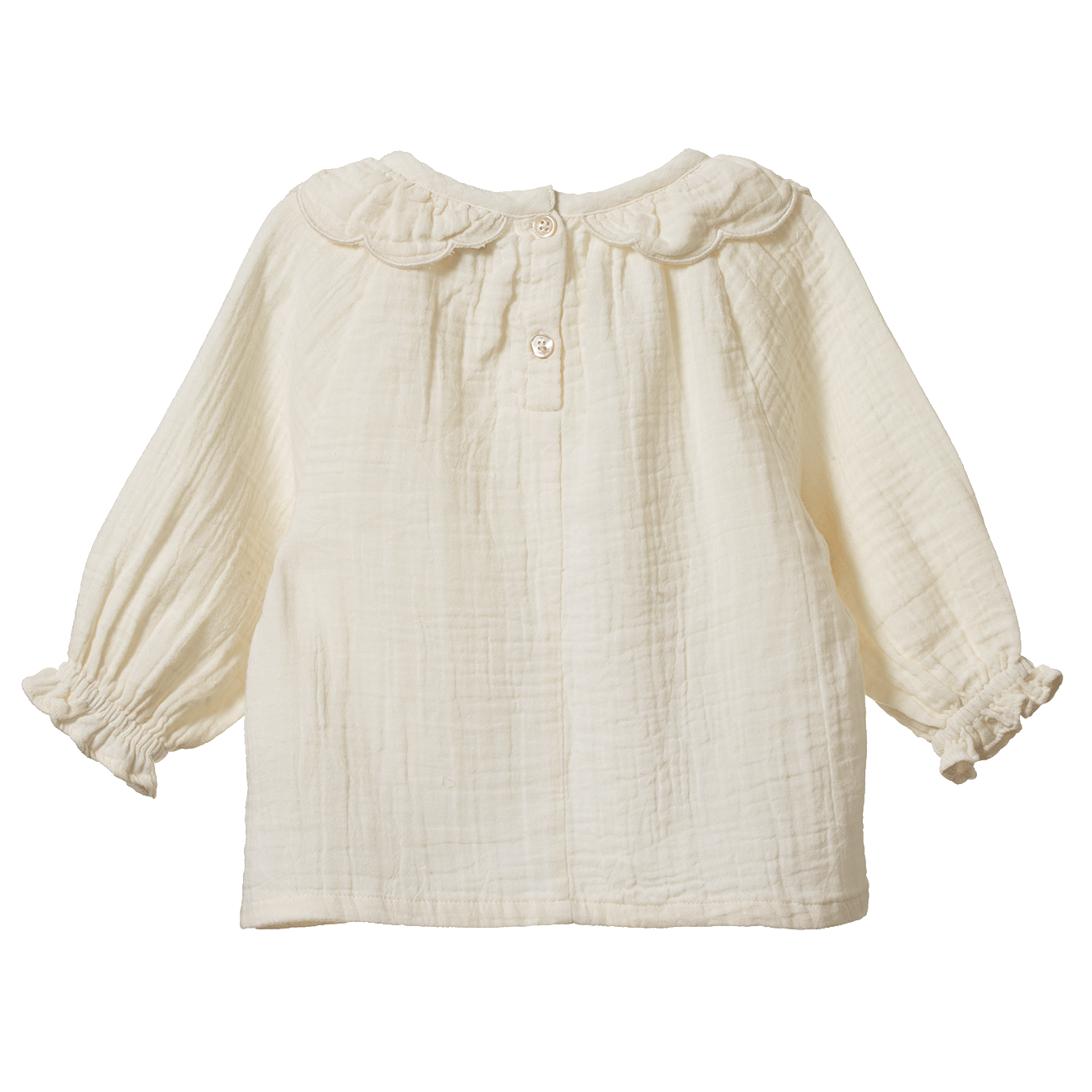 Perfect for any outing, the Muslin Ruffle Cameron Blouse is made from 100% Organic Cotton Crinkle Muslin and features a beautiful ruffle collar at neckline with scalloped embroidery edges. A sweet style, this blouse has gathering at the neckline and an elasticated sleeve hem.