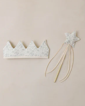 No dress-up look is complete without a crown and wand. The crown features soft ties for an adjustable, comfortable fit, while the star wand is crafted from a wooden dowel, finished with a tinkling bell and flowing tulle ribbon—perfect for every royal occasion. Featuring our 'sky floral' print on our 'ivory' hue. Care: Spot clean only. Made of 100% cotton.