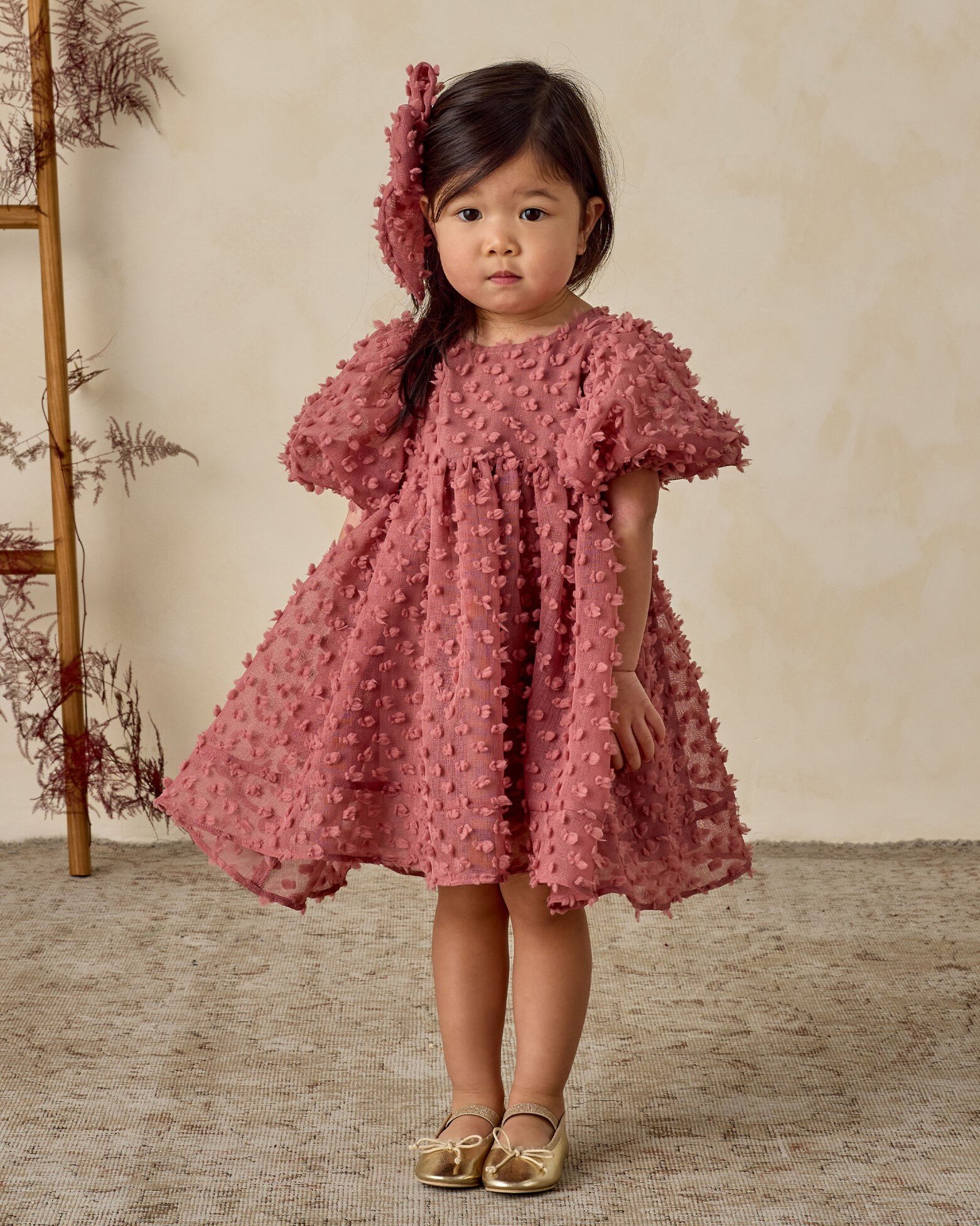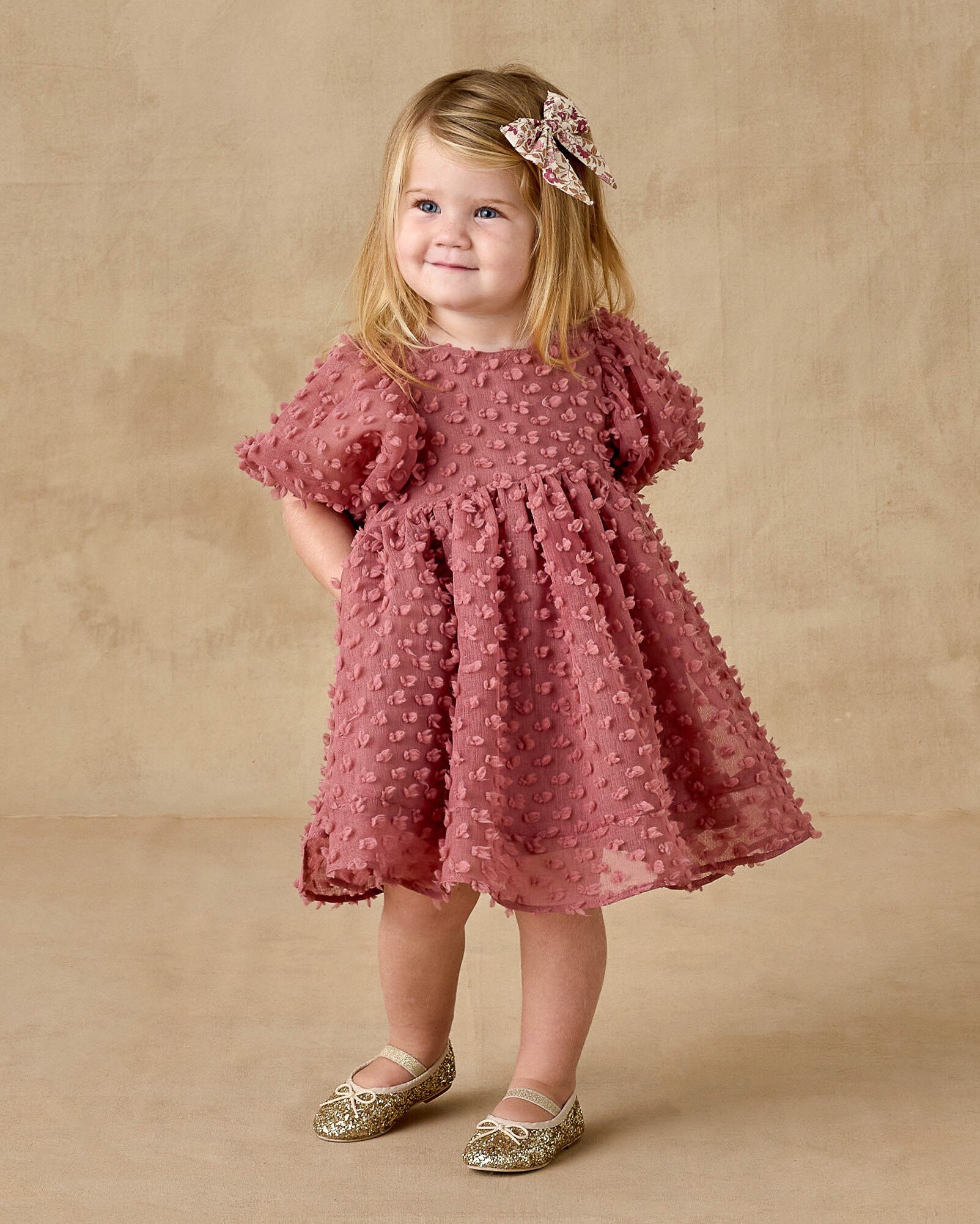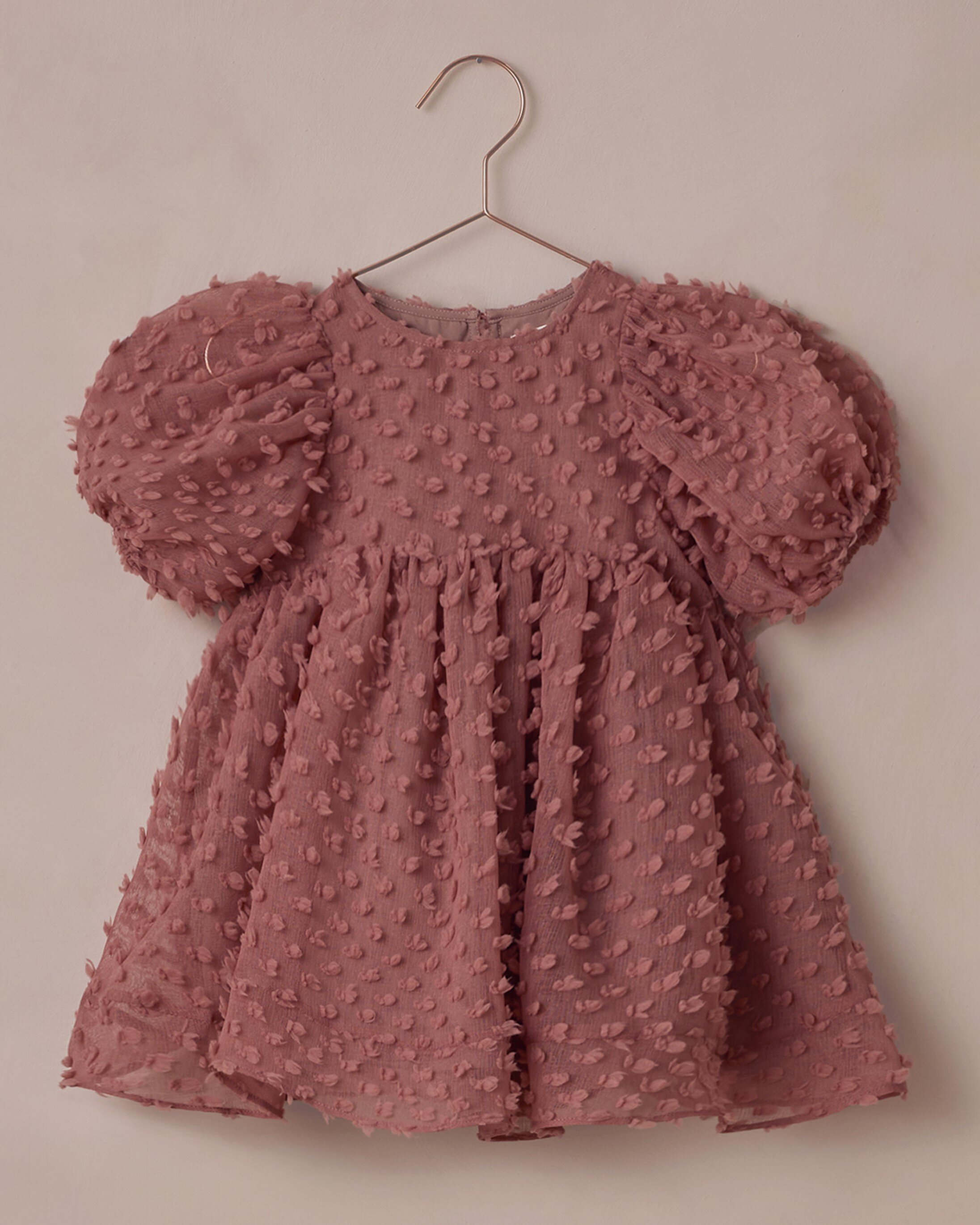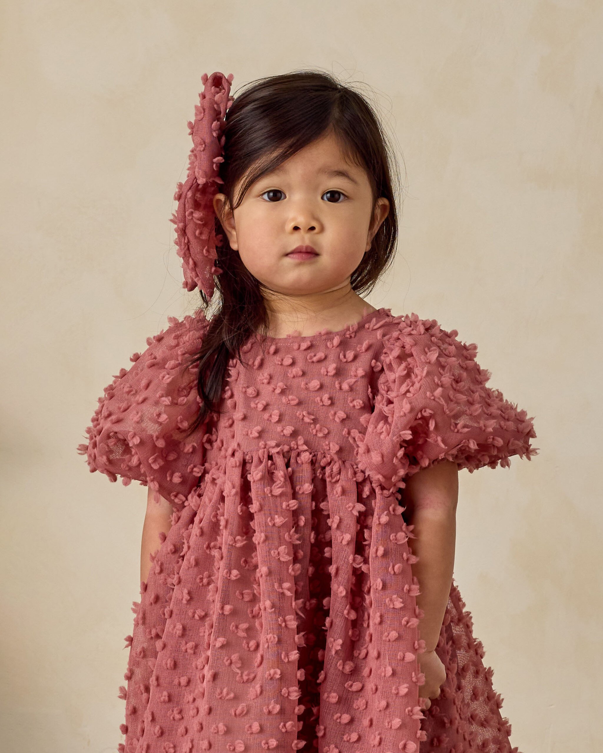Our Luna Dress showcases a babydoll-inspired silhouette with sweet puff sleeves, a gently curved waistline, and two faux shell buttons at the back for a delicate finishing touch. Crafted from our popcorn woven fabric for added texture. Coordinating bloomers included with size 2Y.