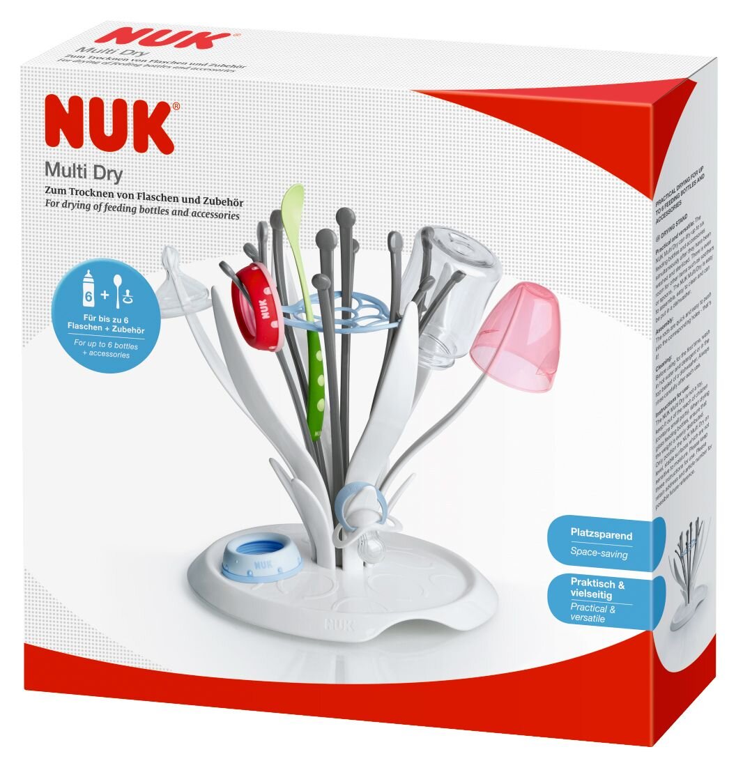 Just where are you going to put all the baby bottles, teats, soothers and other utensils, which have to dry every day after being washed or sterilised? There is now an answer to this question that is just as practical as it is attractive: shaped like a flower, the NUK Multi Dry Rack is an eye-catcher in every kitchen and takes up to six bottles and a great many accessories. Soothers, teats or baby spoons find a place for themselves in the lattice in the centre of the flower.