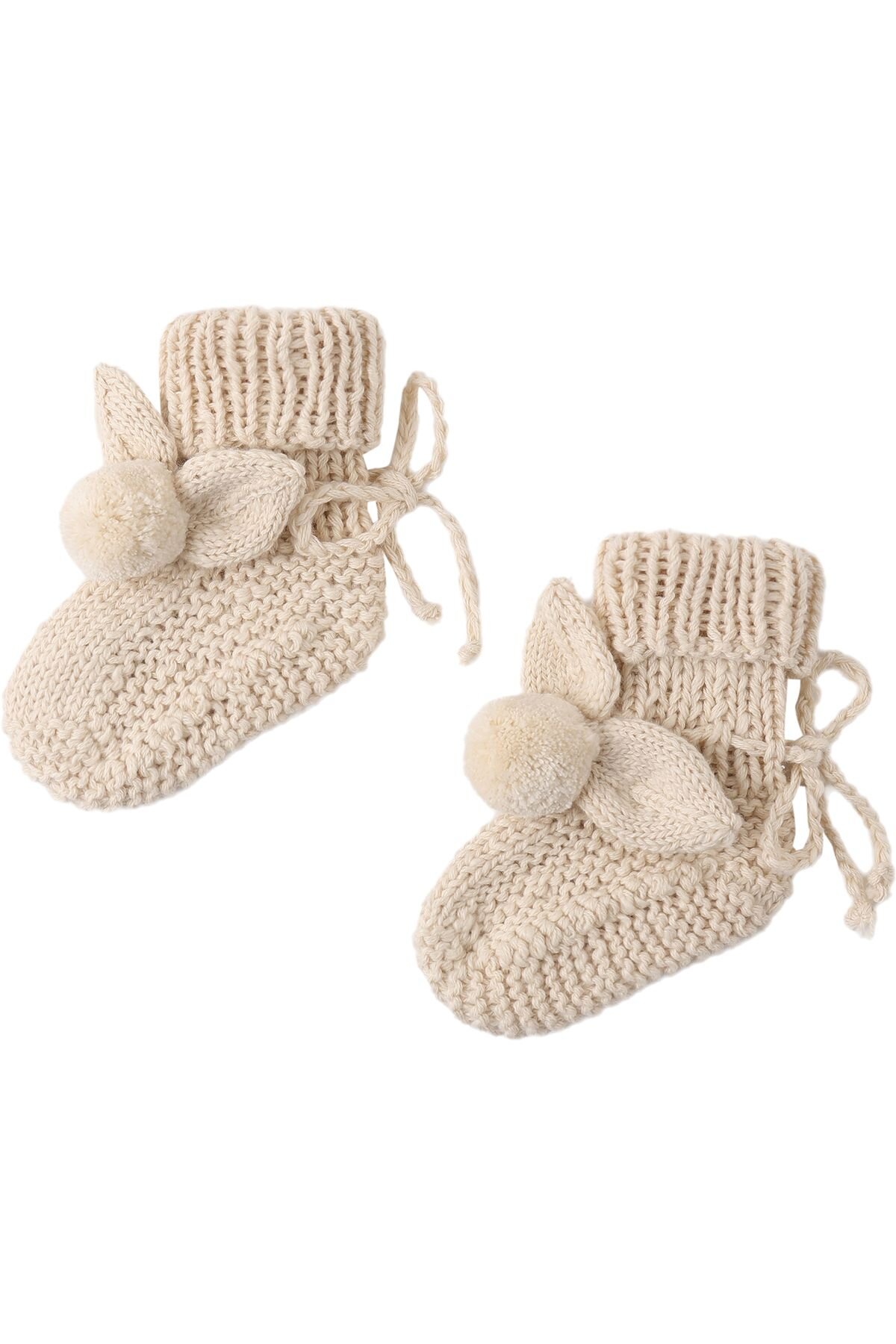 Adorable knit booties featuring a yarn pom bunny at the front with ties at the back for a secure fit. Featuring our ‘ecru’ hue. Hop into spring in these sweet booties. Made of 79% organic cotton, 15% acrylic, 6% linen.