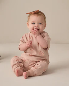The perfect lounge and play set! Our Jersey Tee + Pant Set is sure to be a go-to wardrobe pick. Featuring our ‘carousel’ print on our ‘blush’ hue. Enjoy summer adventures in this fun print. Care: Machine wash cold. Tumble dry low. Made of 100% organic cotton.
