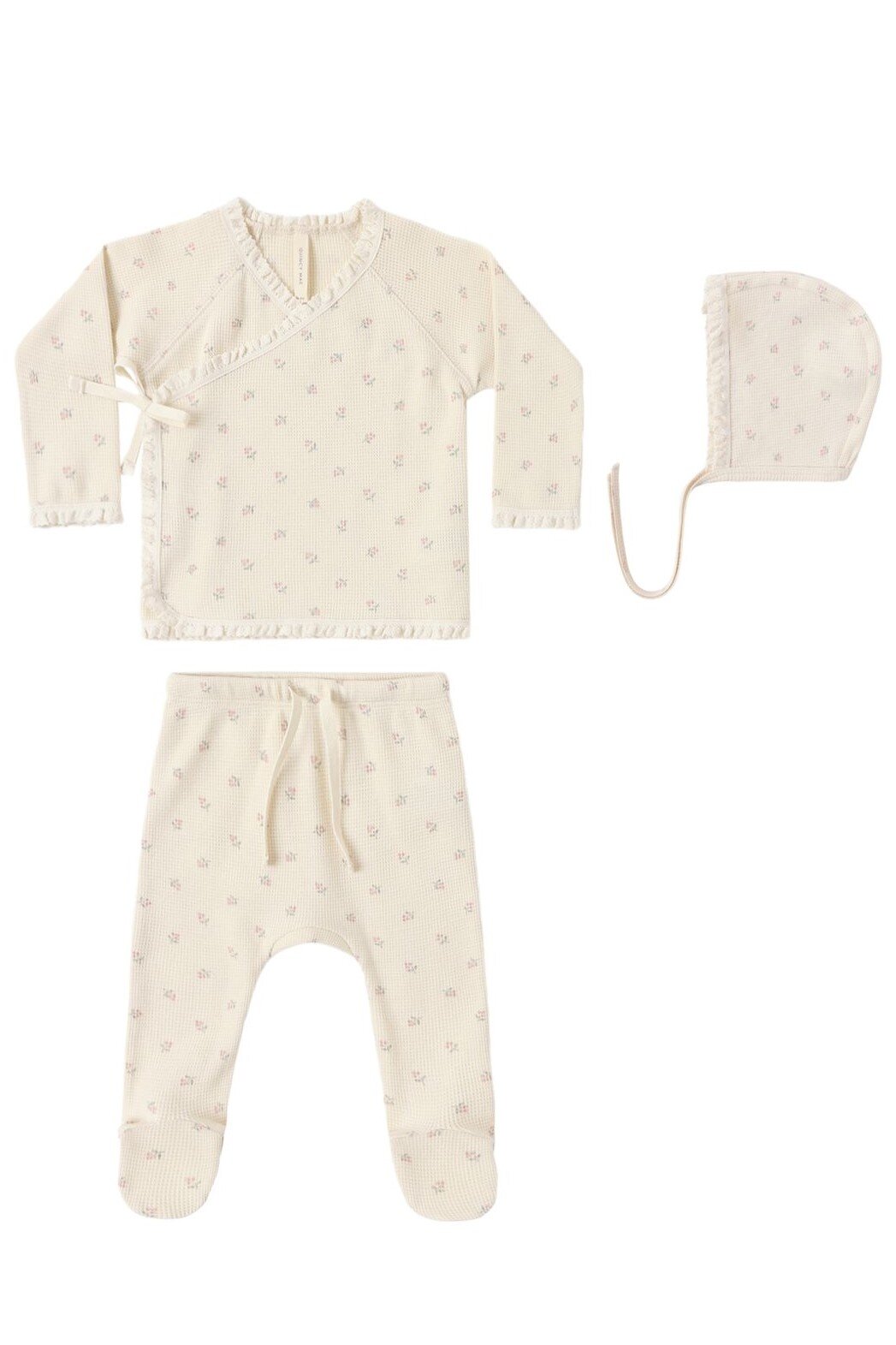 Our Take Home Set in our lightweight waffle material is the perfect look for your newborn. Featuring a sweet bonnet, wrap snap top with crochet lace ruffle detail, and footed drawstring pants. Featuring our delicate ‘mauve ditsy’ print on our 'natural' hue. Care: Machine wash cold. Tumble dry low. Made of 100% organic cotton.