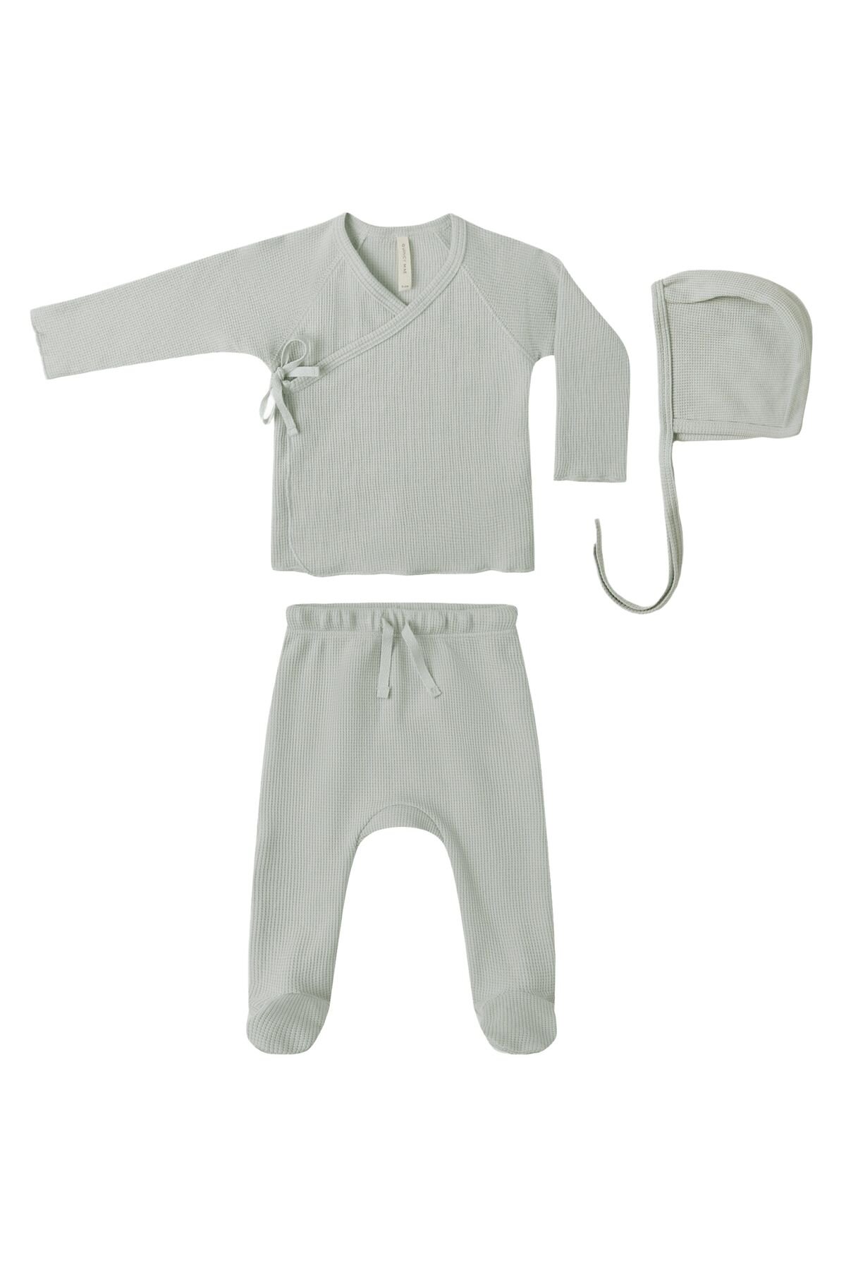 Our Take Home Set in our lightweight waffle material is the perfect look for your newborn. Featuring a sweet bonnet, wrap snap top with crochet lace ruffle detail, and footed drawstring pants. Featuring our 'sage' hue. Care: Machine wash cold. Tumble dry low. Made of 100% organic cotton.
