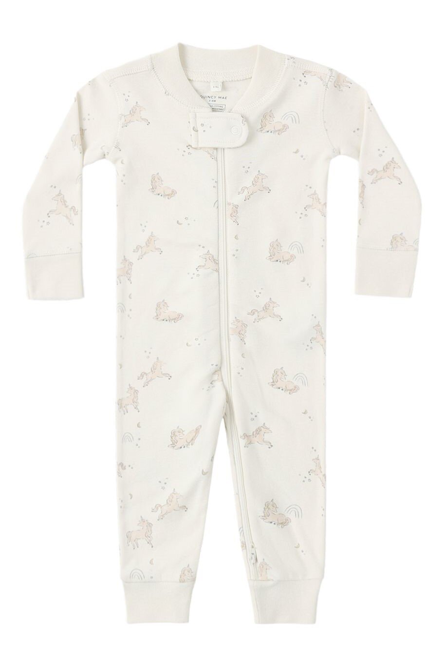 Zip Long Sleeve Sleeper made from our soft organic brushed fabric to keep your little one endlessly cozy. Designed with double zippers for easy changes. Featuring our ‘unicorn’ print on our 'ivory' hue. Care: Machine wash cold. Tumble dry low. Made of 94% organic cotton, 6% elastane CAUTION: KEEP AWAY FROM HEAT AND FLAME