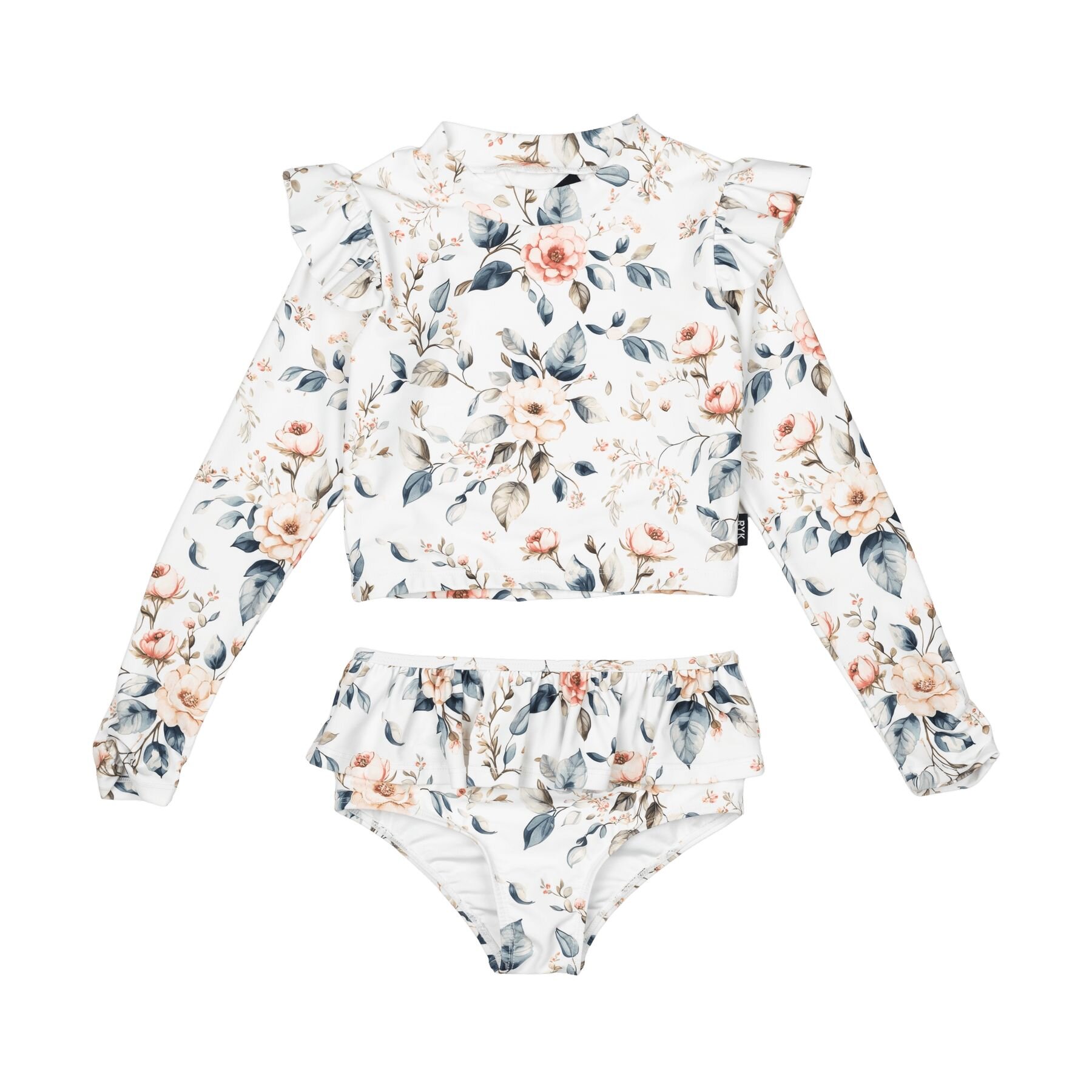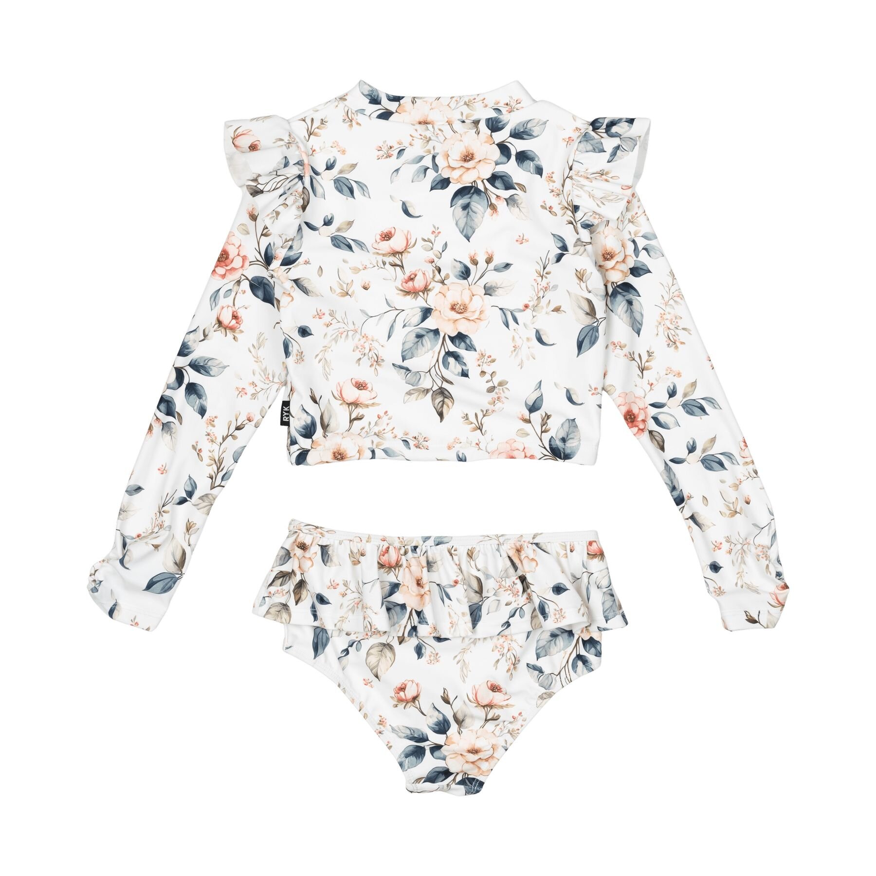 Introducing our Adeline Two Piece! Made from recycled 85% polyester and 15% elastane, this swim set features a crop top with long sleeves, should frills and ruching at the cuffs. The bottoms feature a frill at the waist and a matching cream base with a floral pattern.