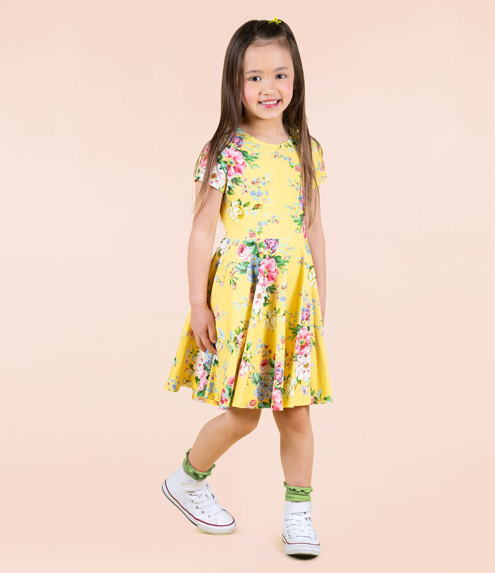 Introducing our Beatrice Waisted Dress! Made from 95% cotton and 5% elastane jersey, this dress features short sleeves, a full circle skirt, front side pockets and a yellow base with a floral pattern.