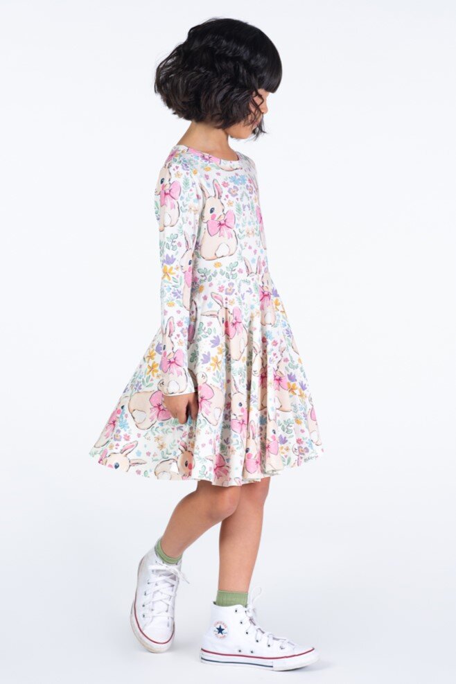 Introducing our Bunny Waisted Dress! Made from a blend of 95% cotton and 5% elastane jersey, this dress features a floral bunny pattern on a cream base. Features long sleeves, a full circle skirt, and front side pockets.