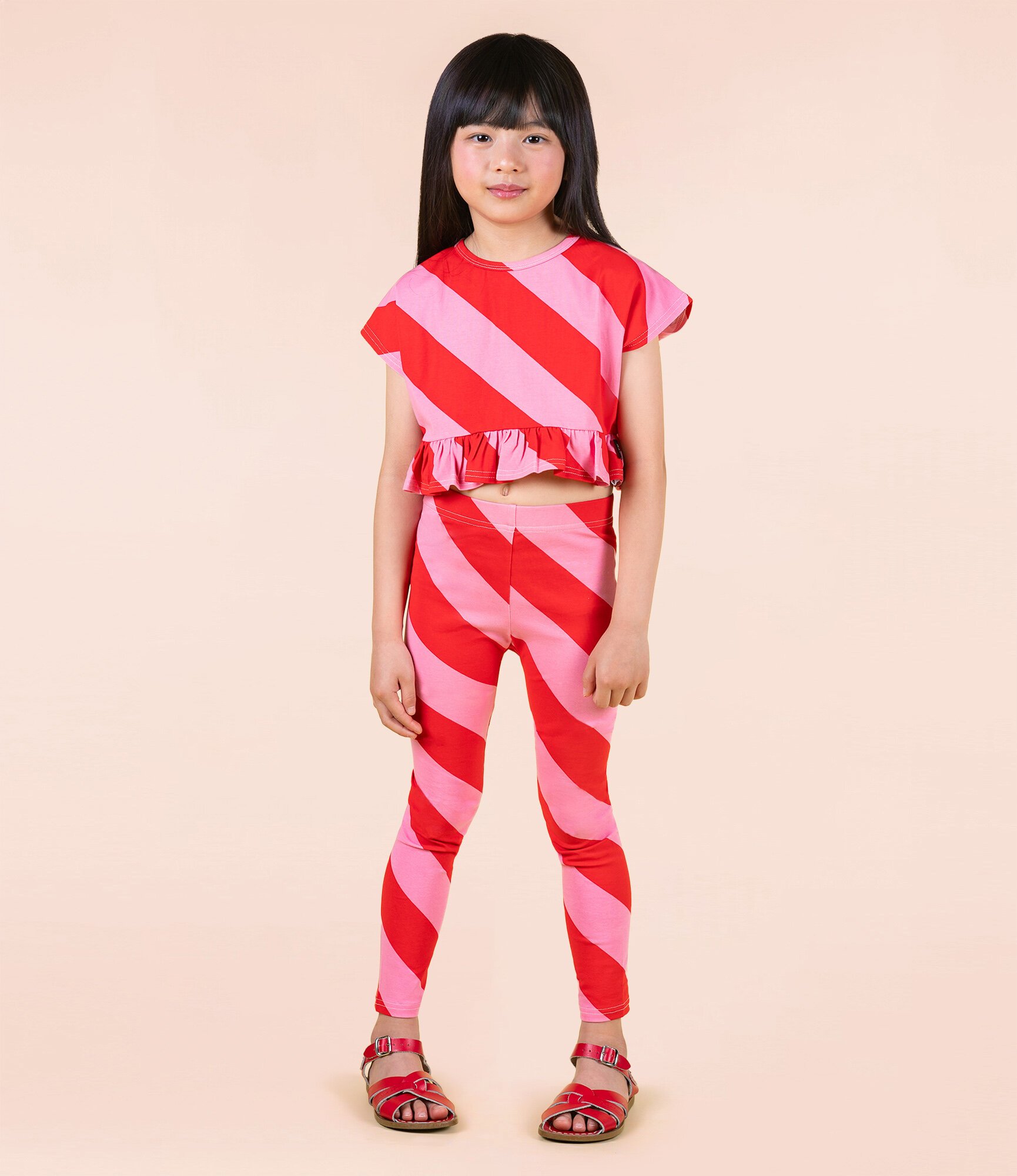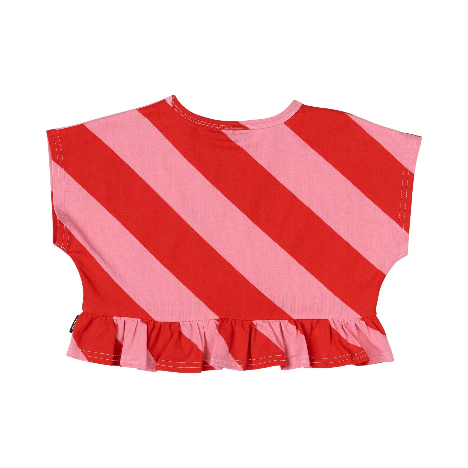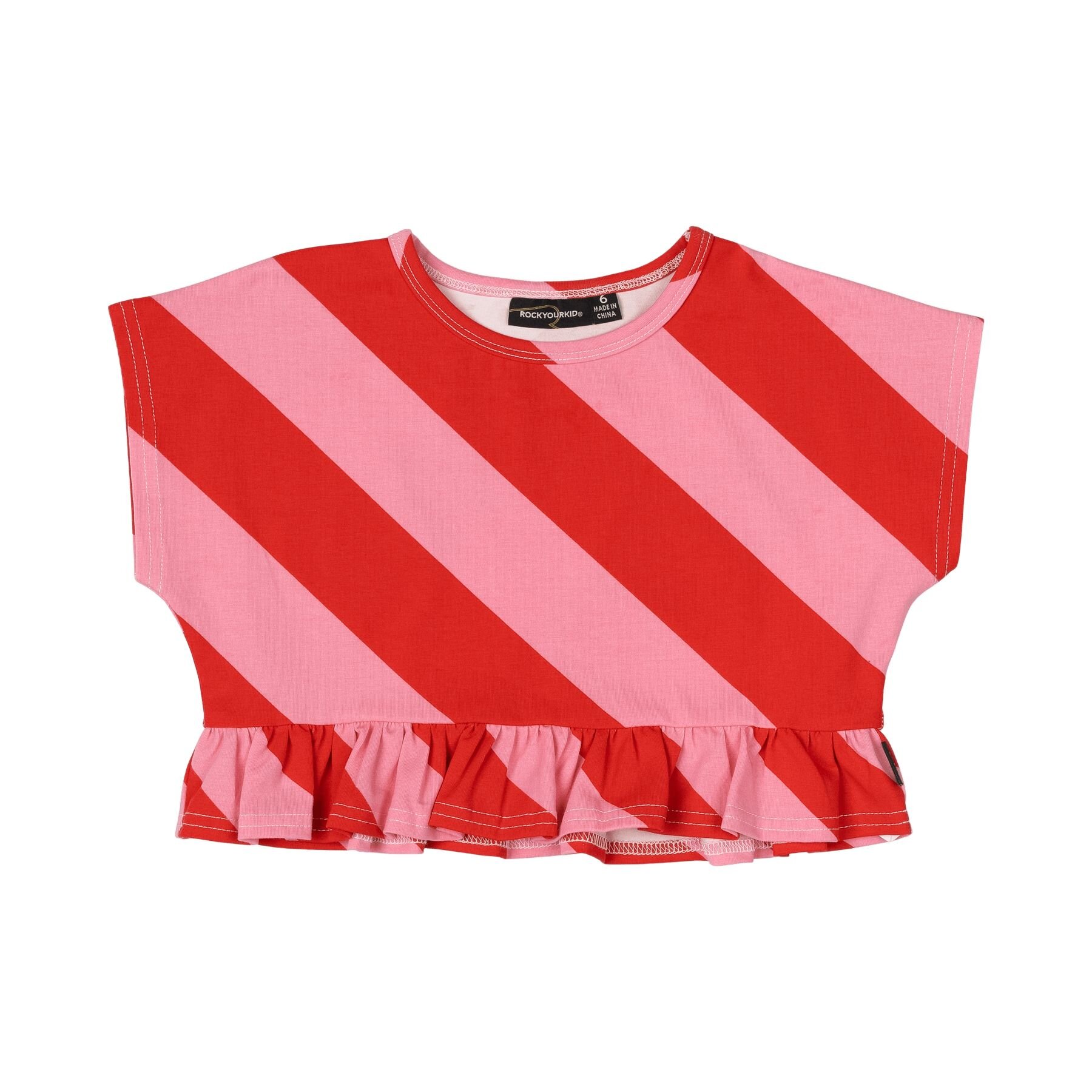 Introducing our Candy Wrap Frill T-Shirt! Made from 95% cotton and 5% elastane jersey, this red and pink striped t-shirt features a boxy, looser fit with short sleeves and a frill at the waist