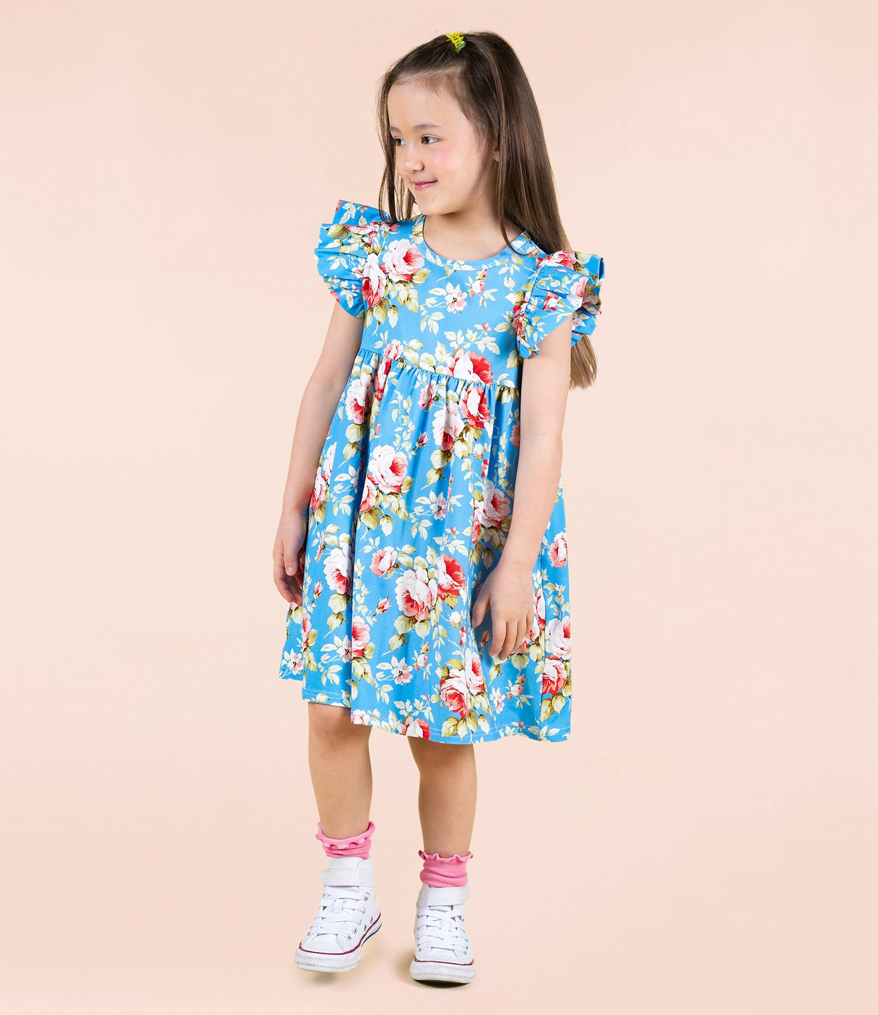 Introducing our Darcy Dress! Made from 95% cotton and 5% elastane jersey, this dress features frill short sleeves, a gathered skirt, side slit pockets and a blue base with a floral pattern.