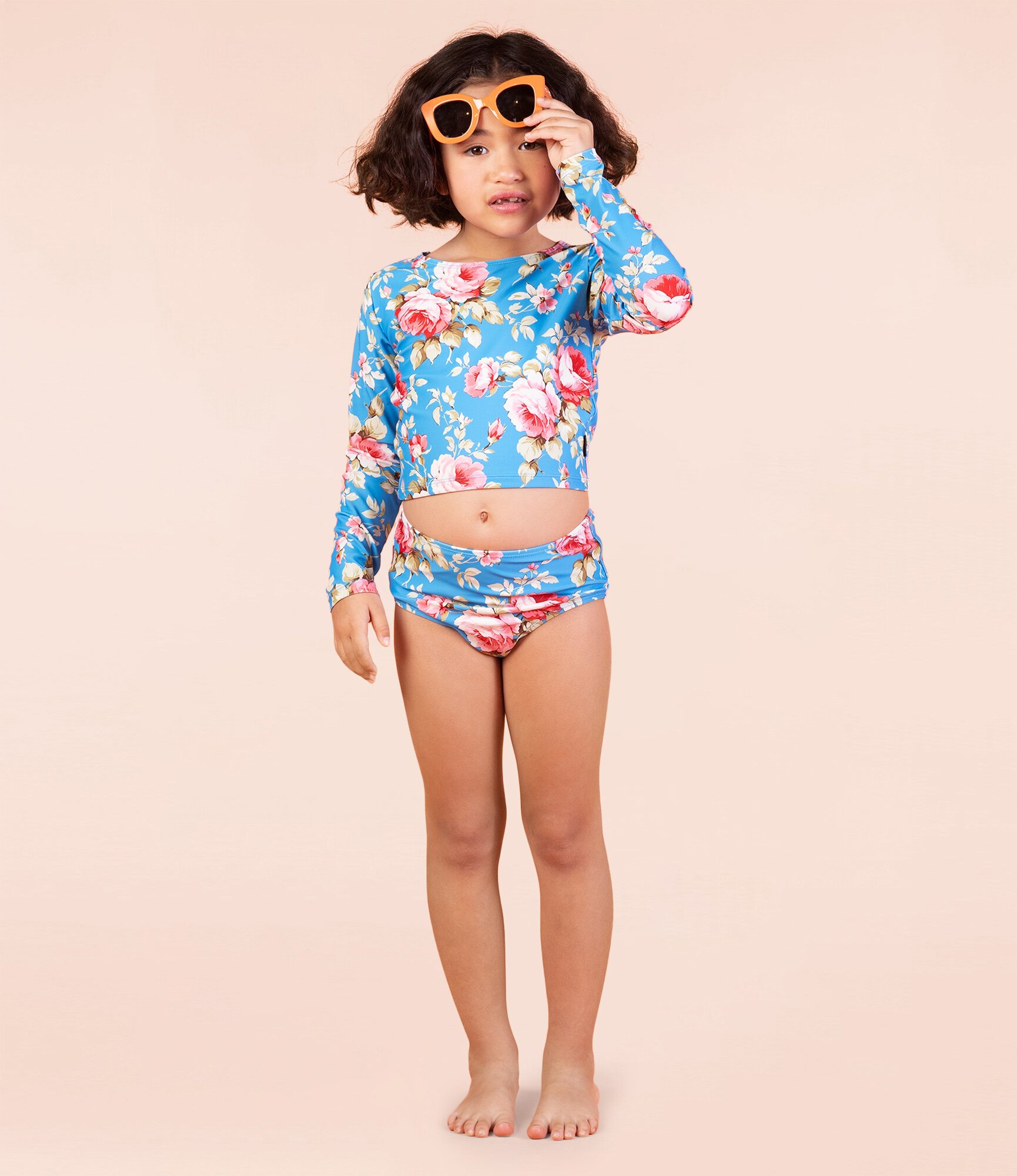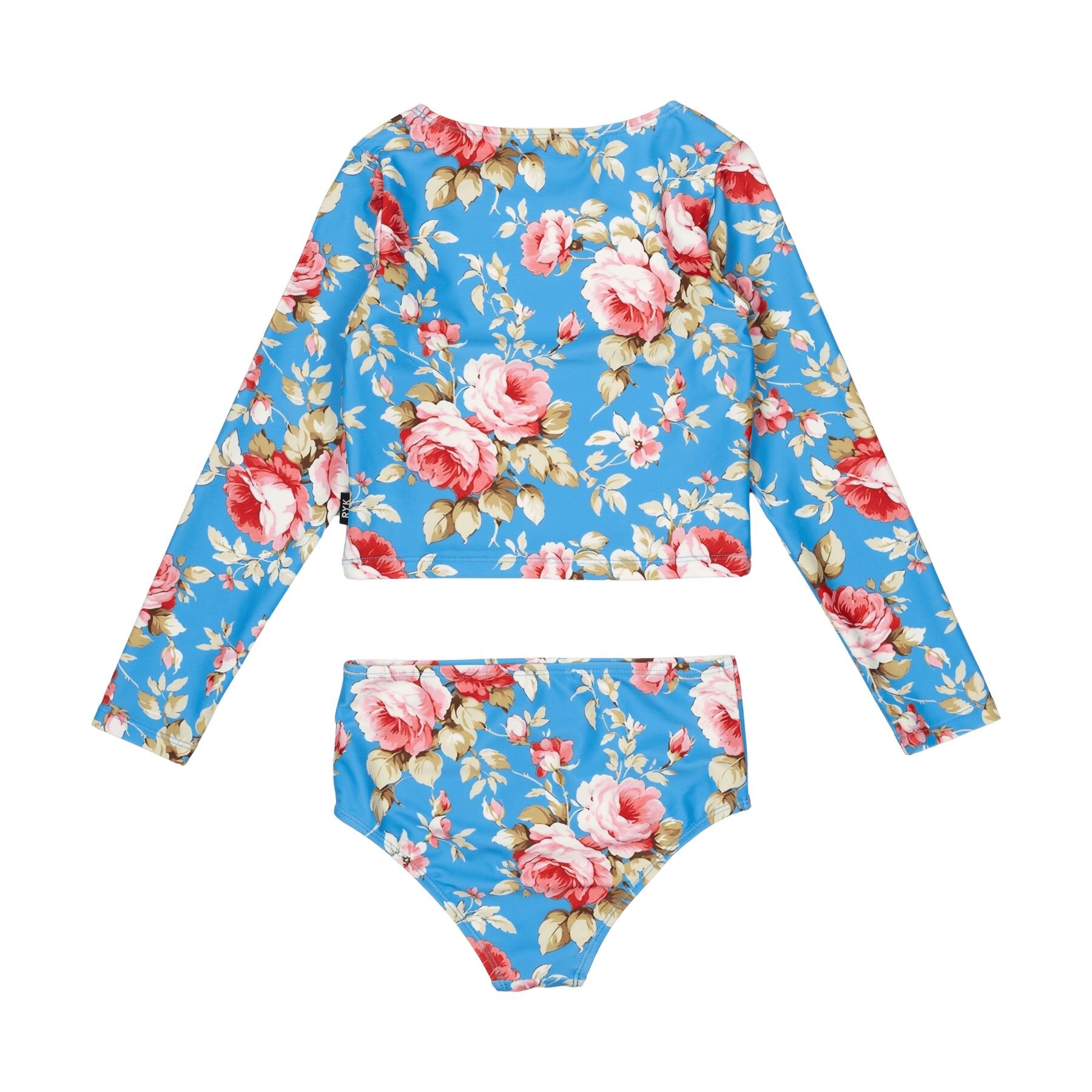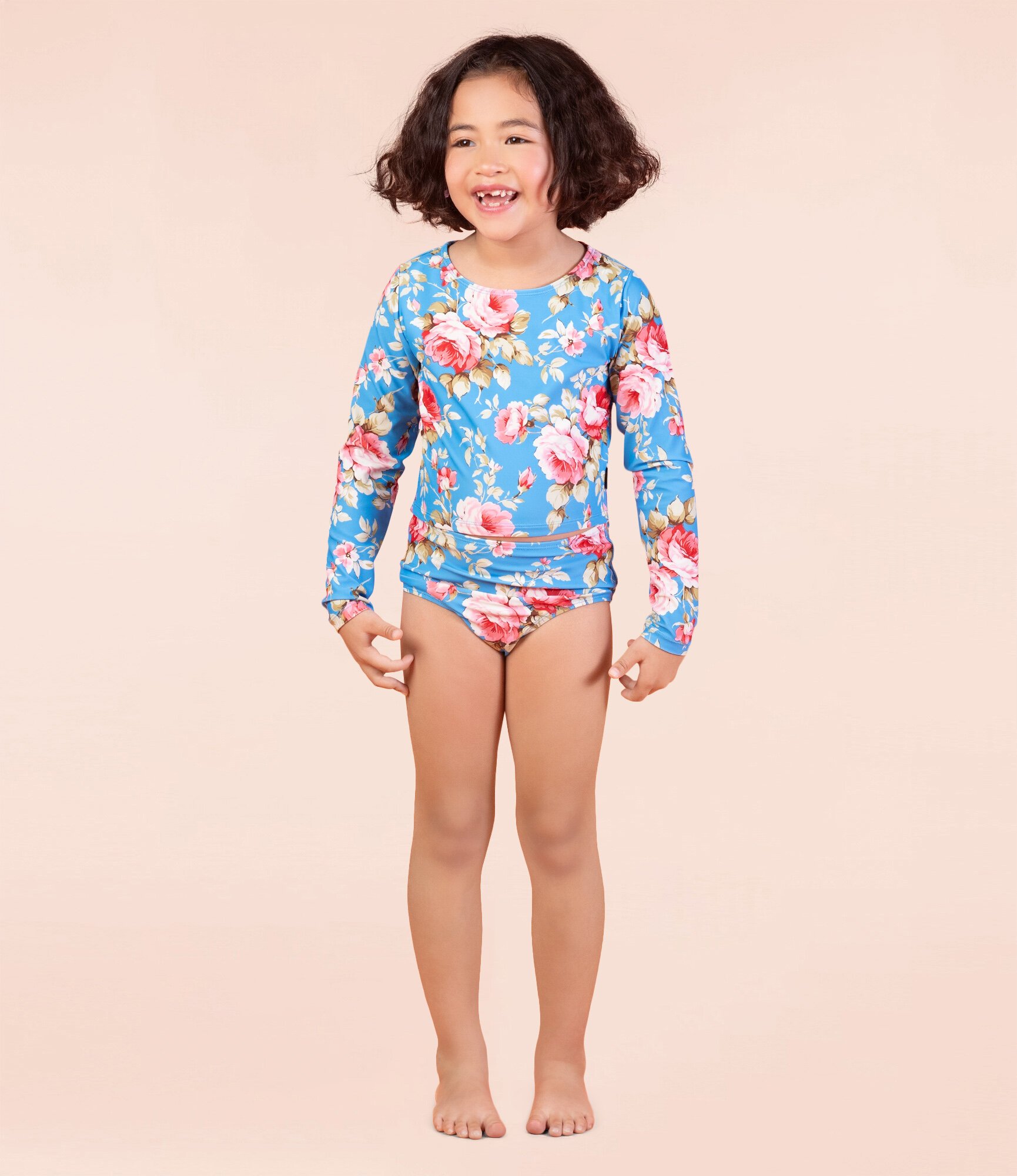 Introducing our Darcy Rashie Set! Made from recycled 95% polyester and elastane, this UPF50+ rashie set features a scoop neck top with set in long sleeves and high waisted pants in a matching floral pattern on a blue base.