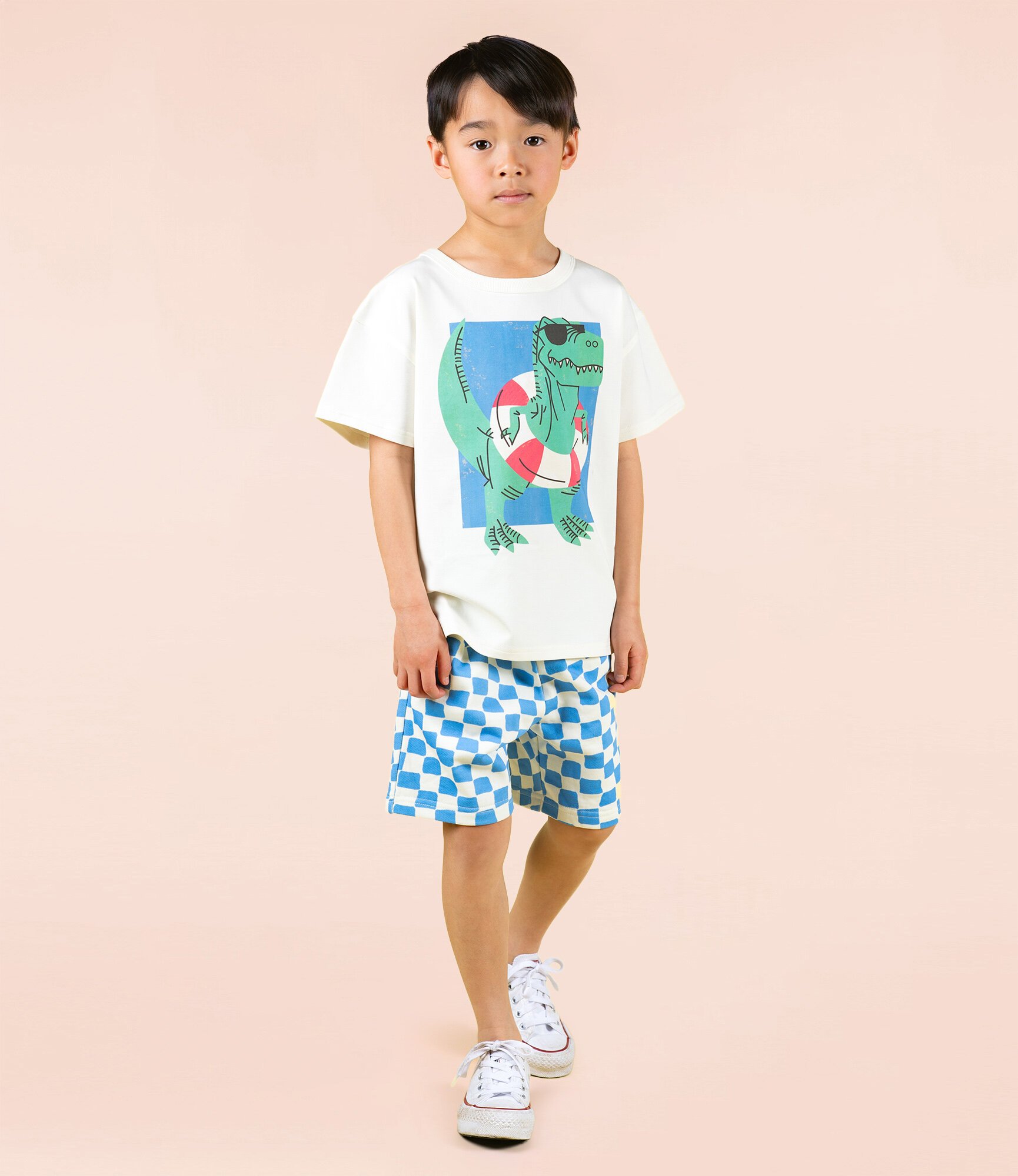 Introducing our Dino Swim T-Shirt! Made from 95% cotton and 5% elastane jersey, this t-shirt features a cream rib neck bind, boxy loose fit, short sleeves, and a cream base with a swimming dinosaur print.
