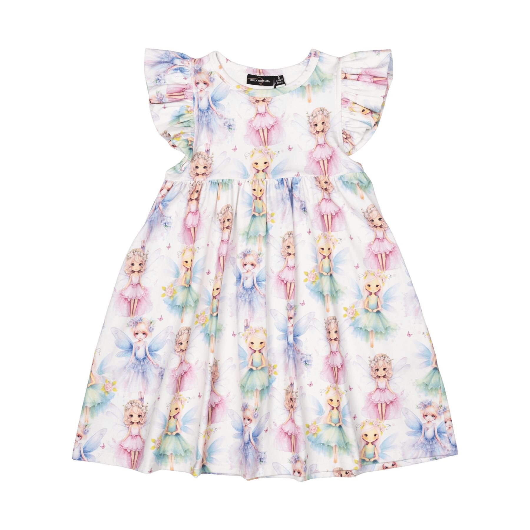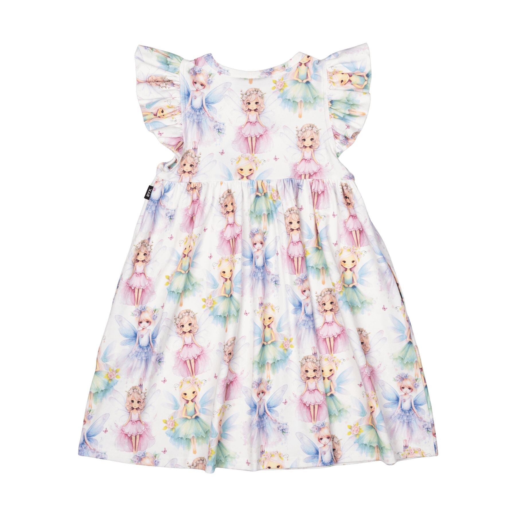 Introducing our Frolic of Fairies Dress! Made from 95% cotton and 5% elastane jersey,  this dress features frill short sleeves with colourful tassel trims, a gathered skirt with side slit pockets and a fairy-inspired pattern.