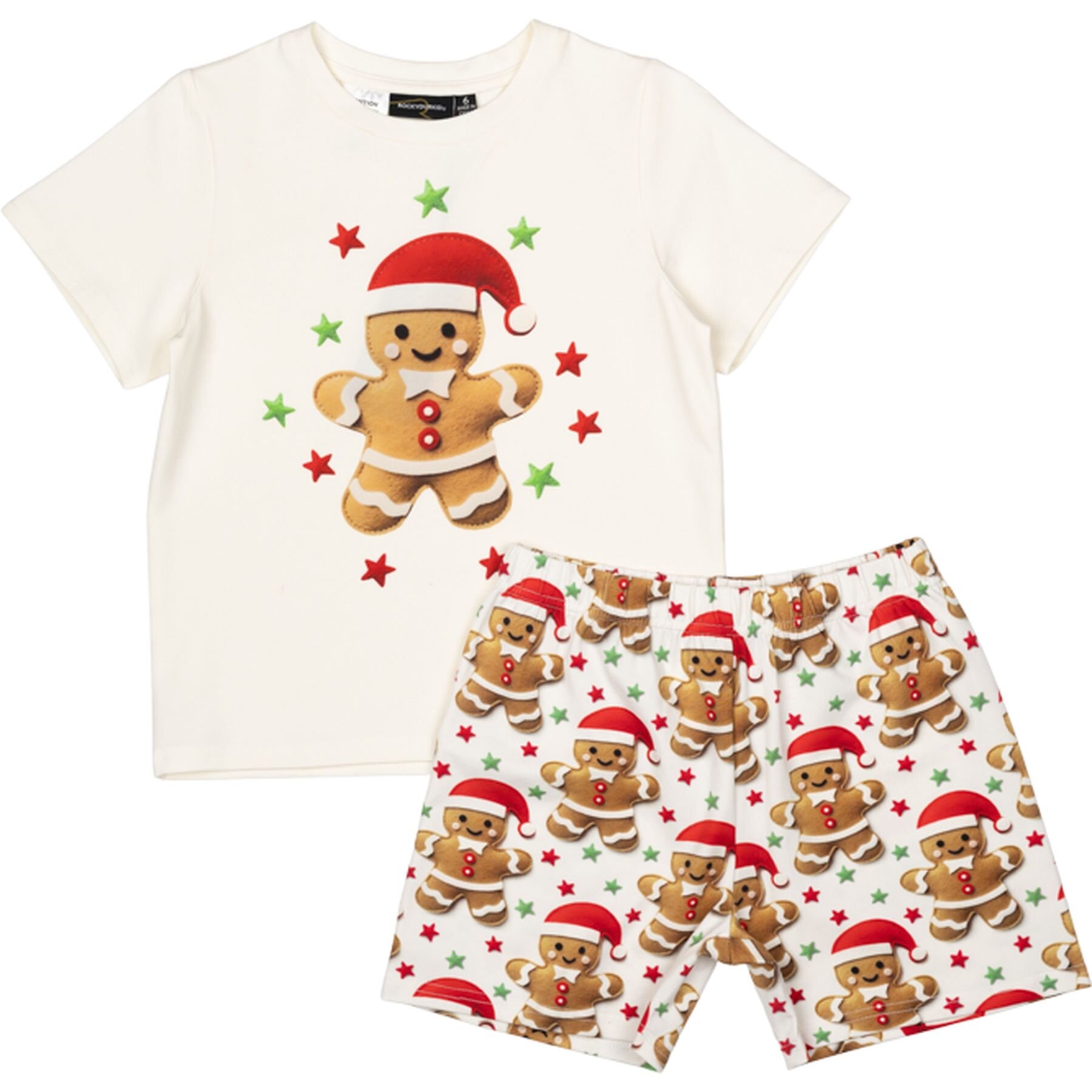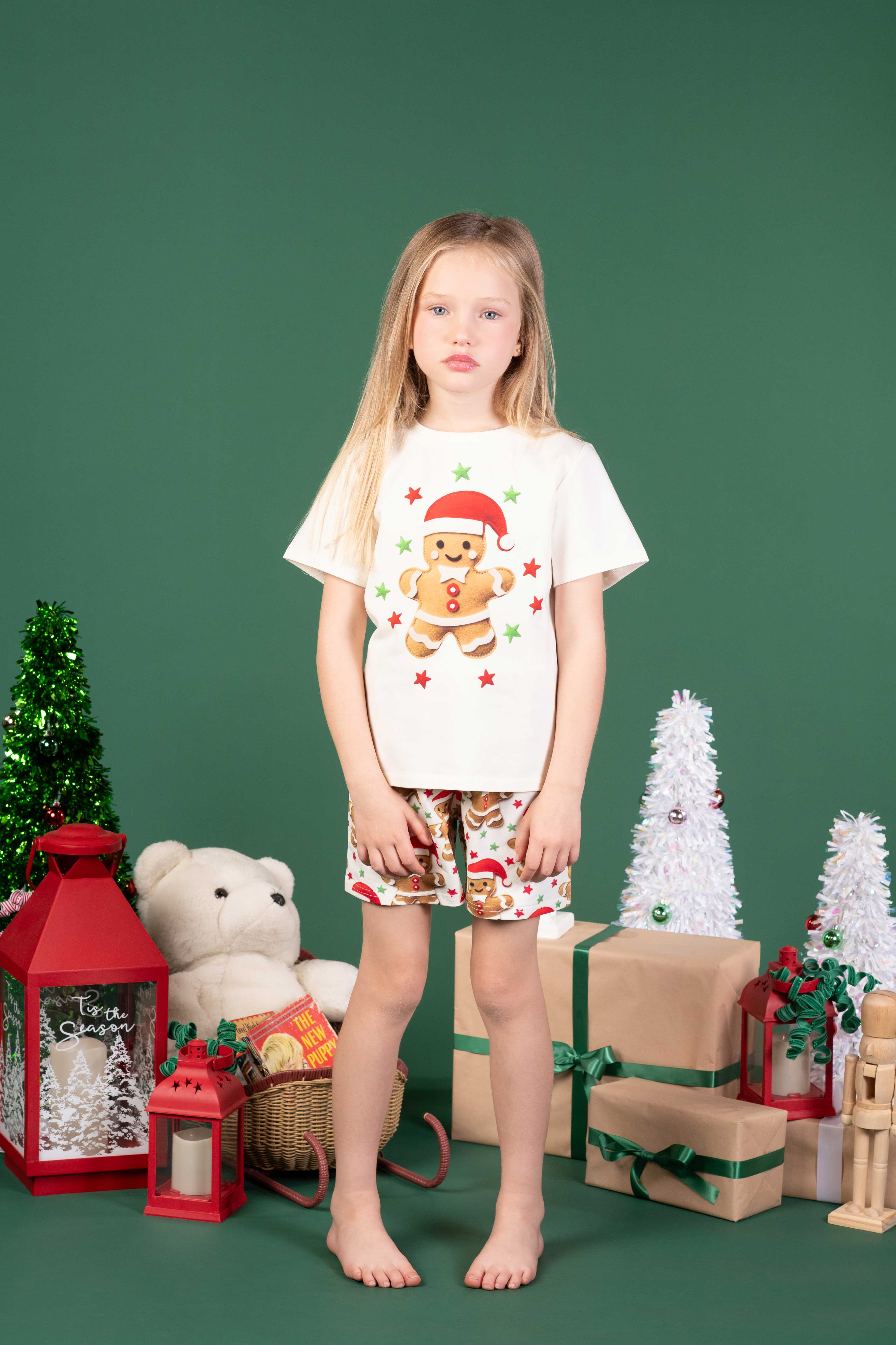 The Gingerbread Man PJ Set features a cute gingerbread man in a Santa hat, ideal for holiday nights. Made from cosy 95% Cotton and 5% Elastane Jersey, with a comfy boxy tee and elastic shorts.