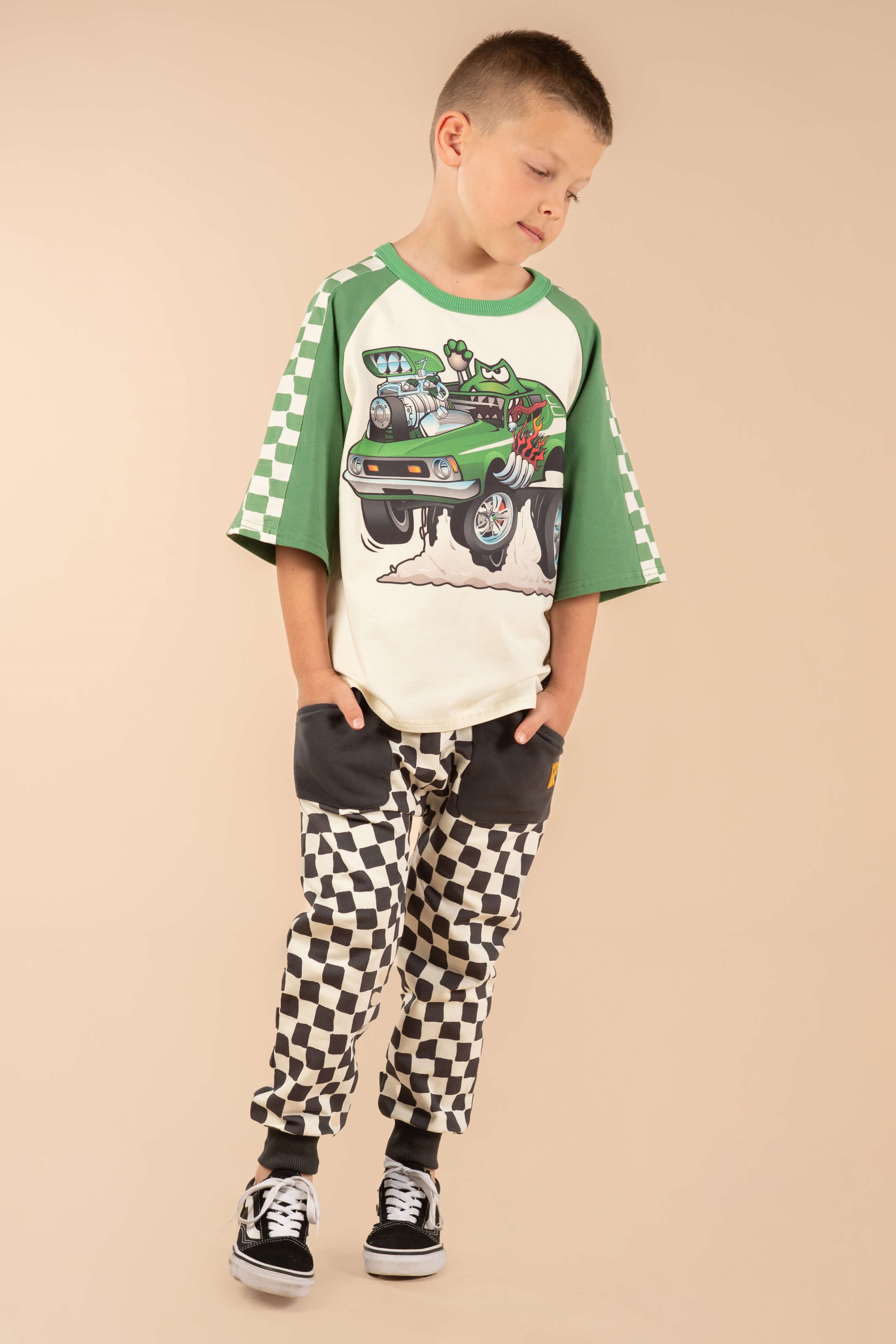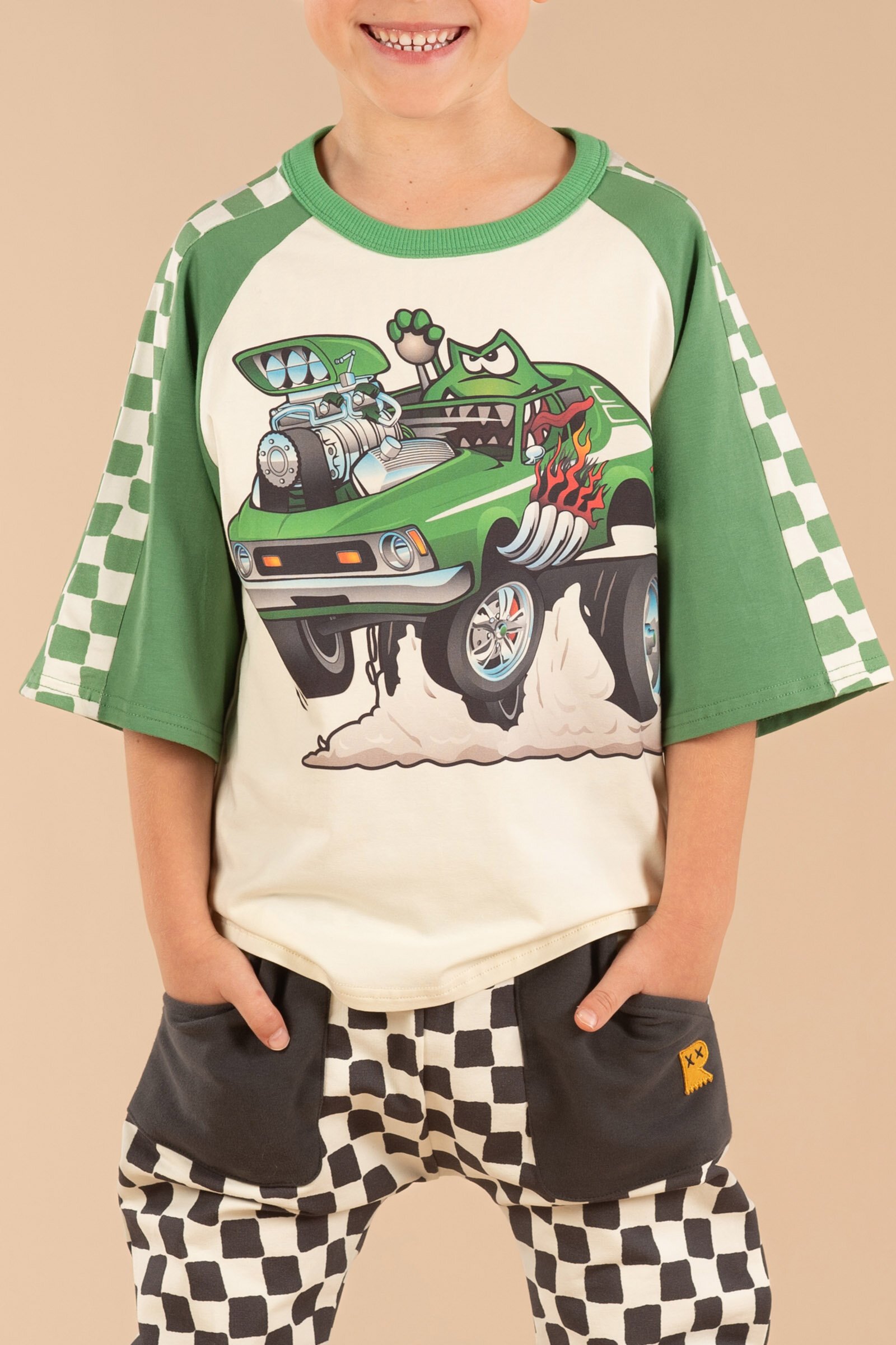Introducing our Green Machine 3/4 Sleeve T-Shirt! Made from soft cotton elastane jersey, this short sleeve t-shirt features green 3/4 raglan sleeves with a contrast checkerboard side panel print, and a front car pattern.
