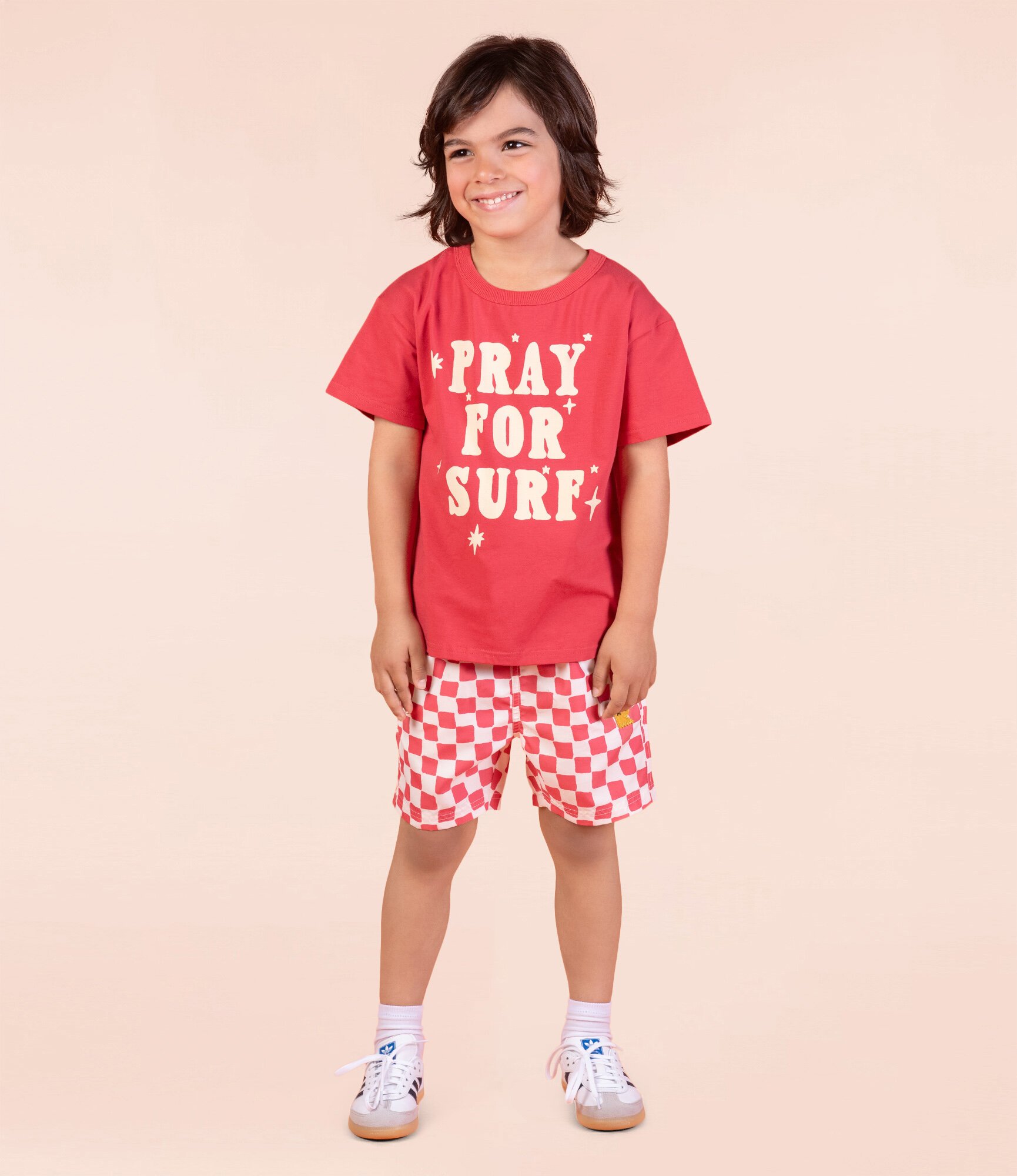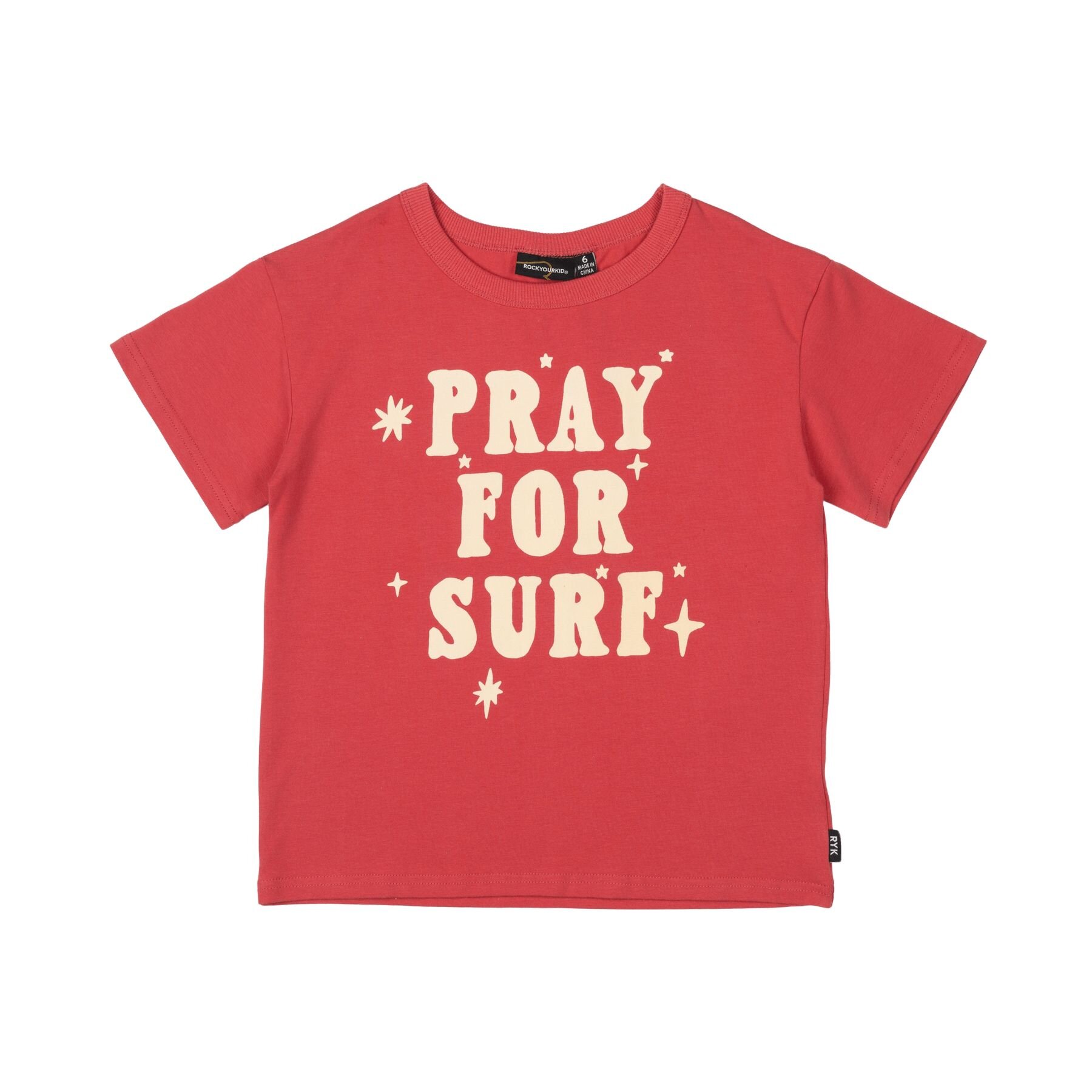 Introducing our Pray For Surf T-Shirt! Made from 95% cotton and 5% elastane jersey, this t-shirt features drop shoulder short sleeves, a boxy looser fit, and a red base with a white ‘pray for surf’ print.
