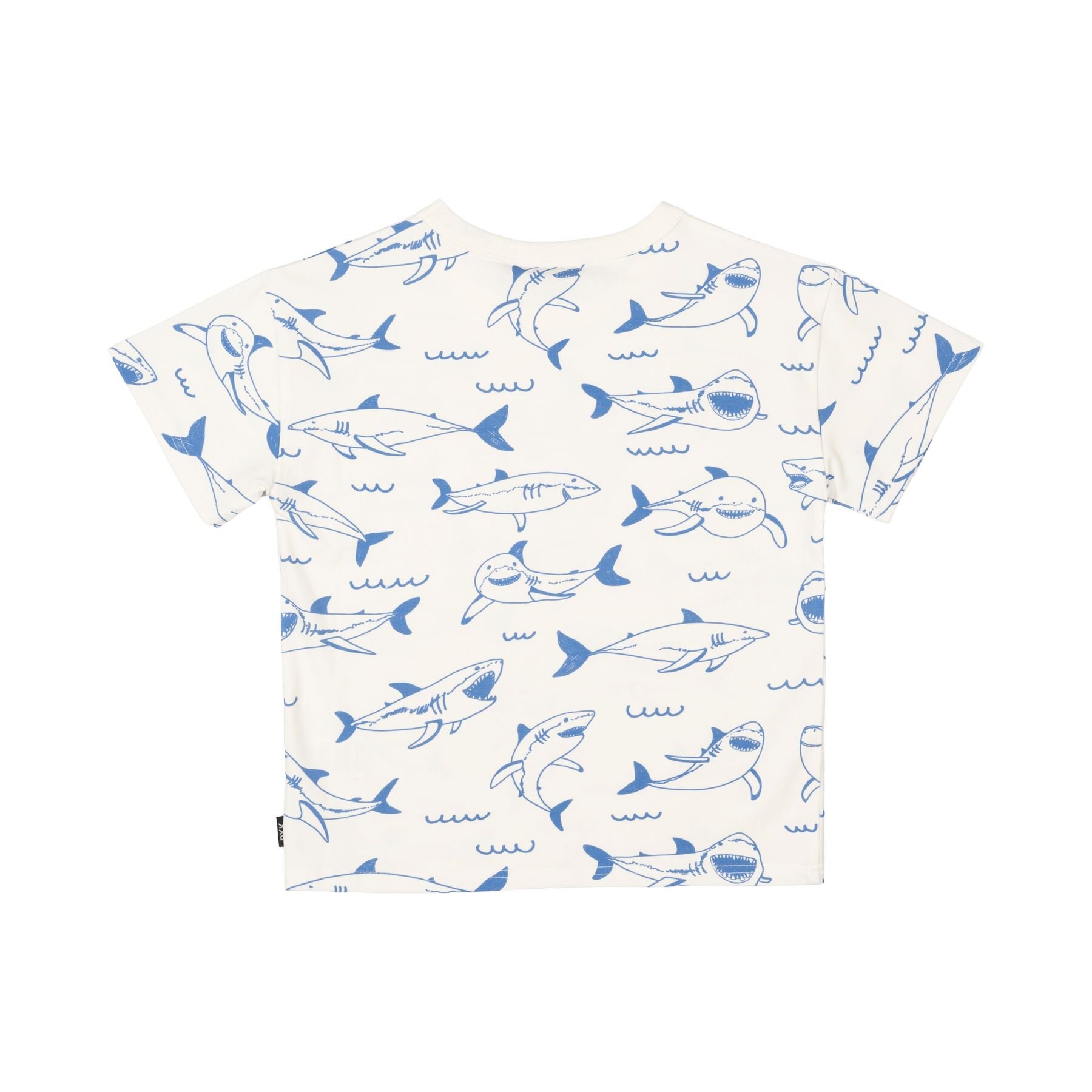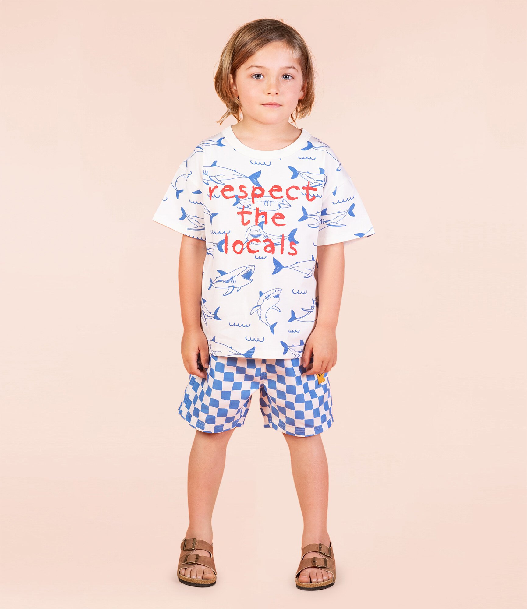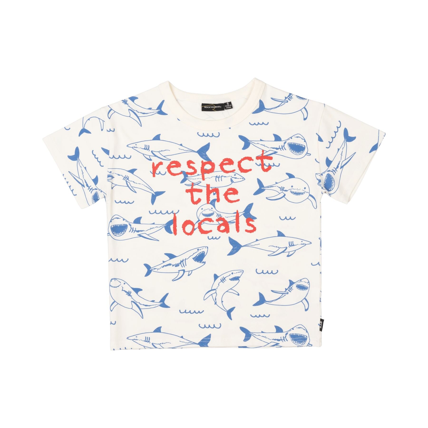 Introducing our Respect The Locals T-Shirt! Made from 95% cotton and 5% elastane jersey, this t-shirt features a cream rib neck bind, boxy loose fit, short sleeves, and a cream base with a blue shark print saying ‘respect the locals.’