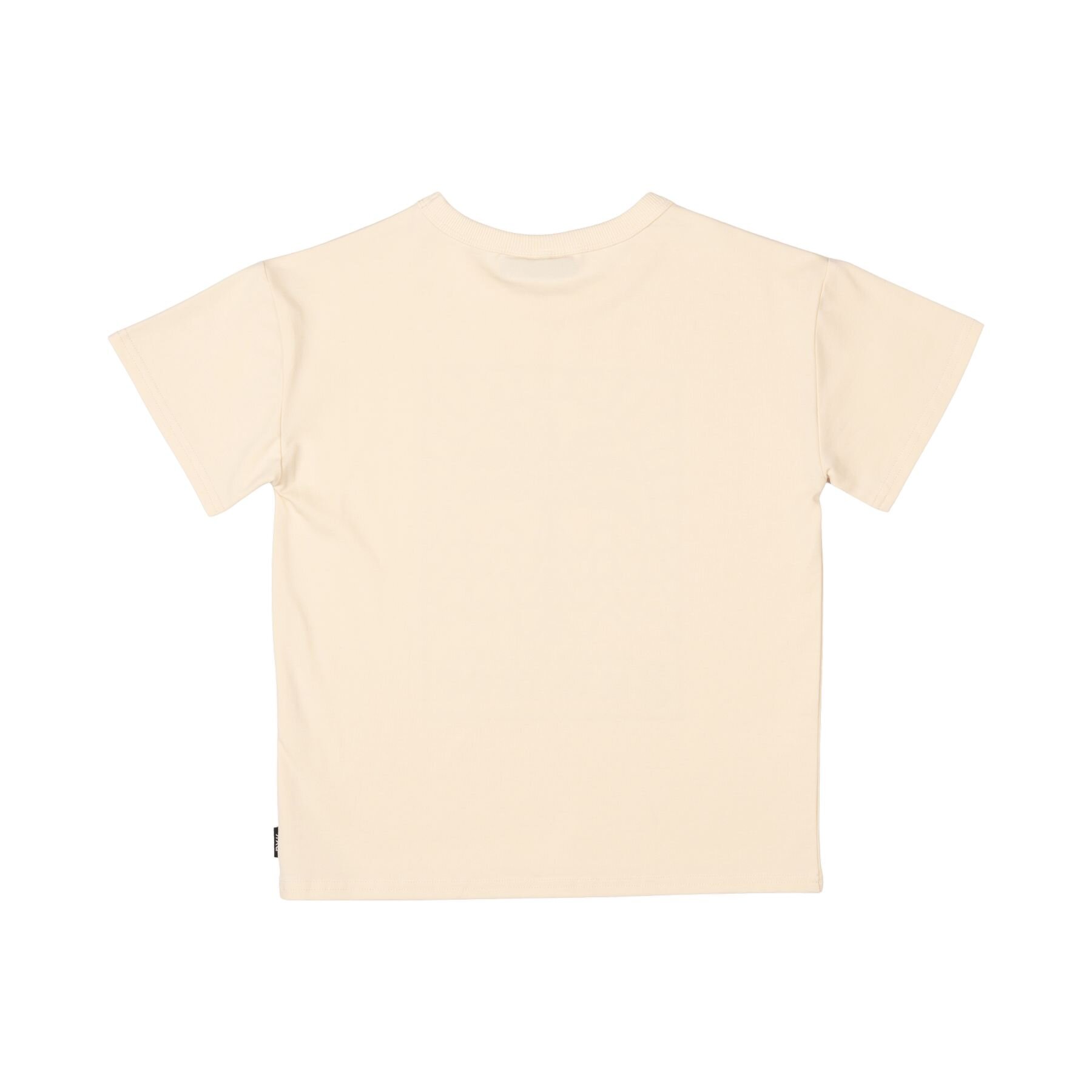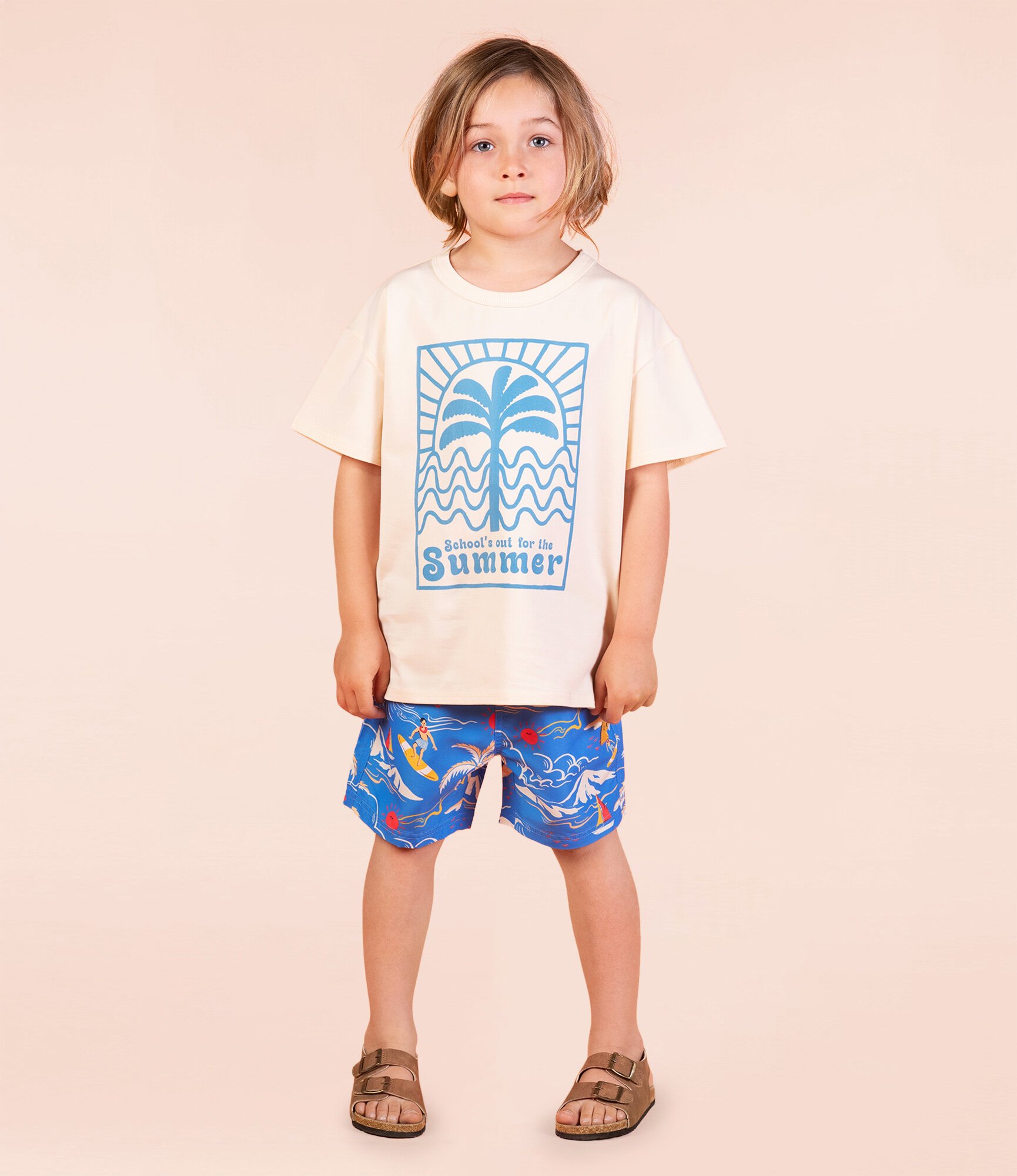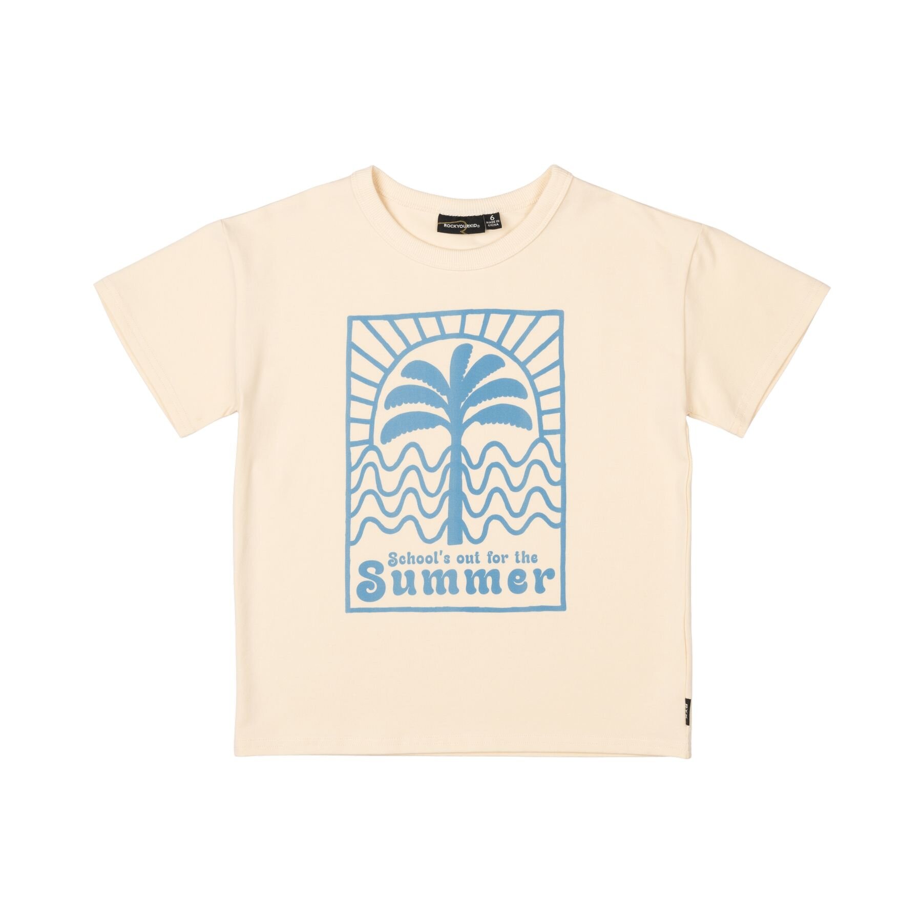 Introducing our Schools Out T-Shirt! Made from 95% cotton and 5% elastane jersey, this t-shirt features a cream rib neck bind, boxy loose fit, short sleeves, and a cream base with a blue palm tree print saying ‘schools out for the summer.’