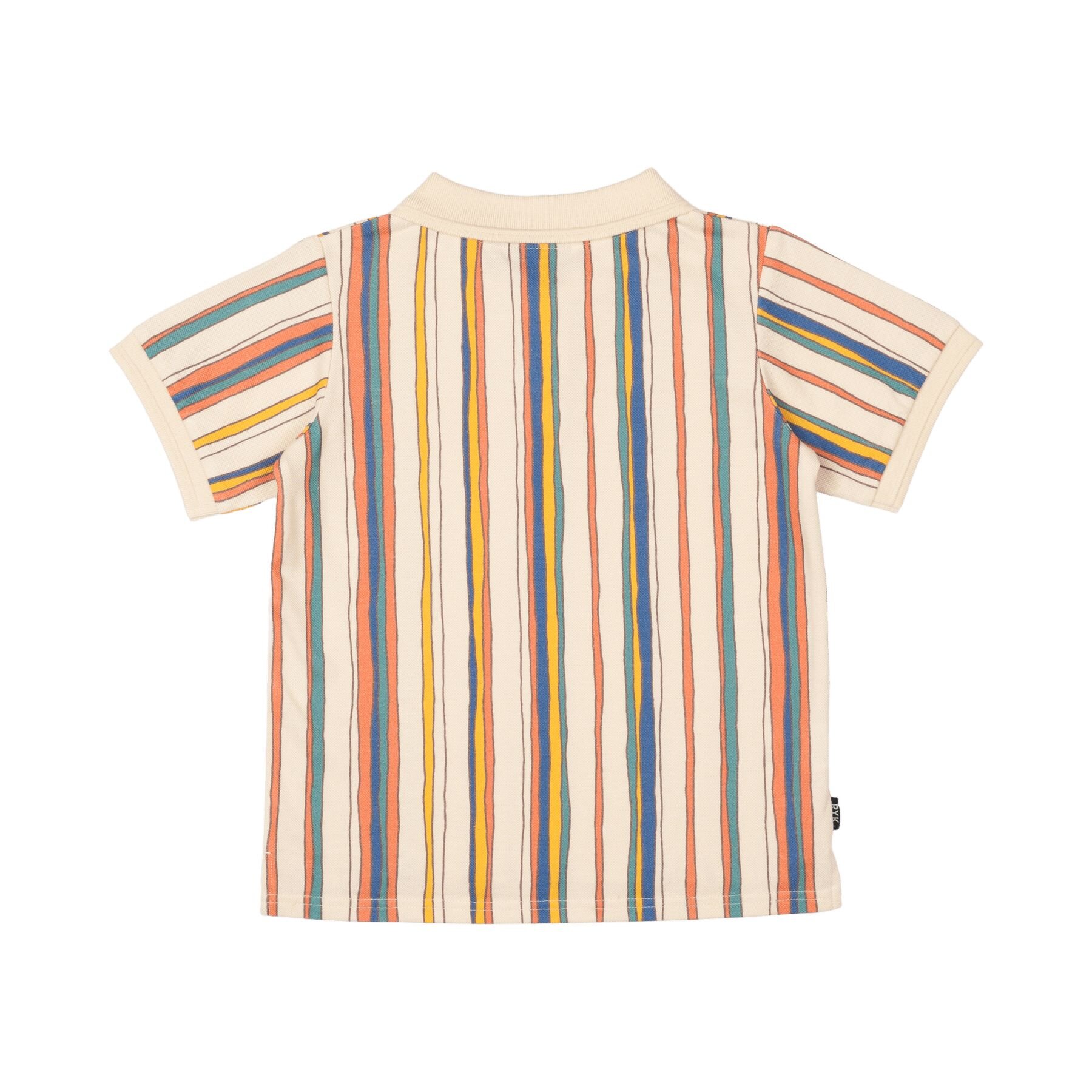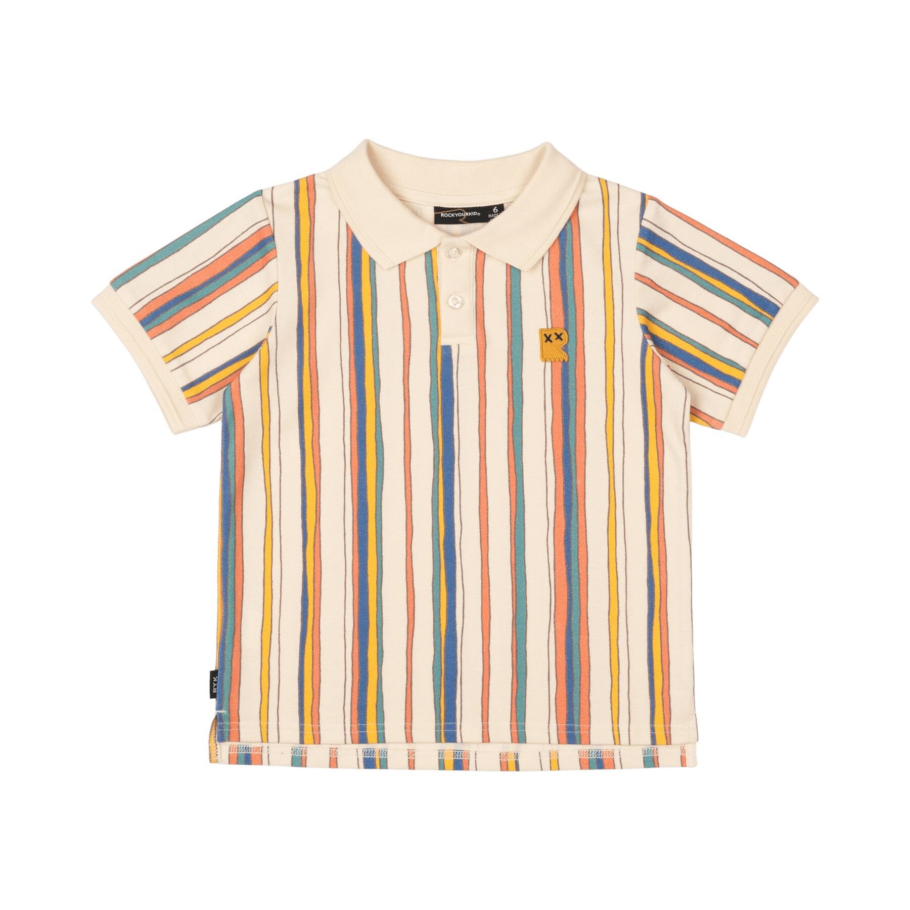 Introducing our Stripe Polo T-Shirt! Made from 84% cotton, 12% polyester, and 4% elastane, this t-shirt features a cream rib collar and armholes, drop shoulder short sleeves, multi-color buttons, and a cream base with a colorful stripe pattern.