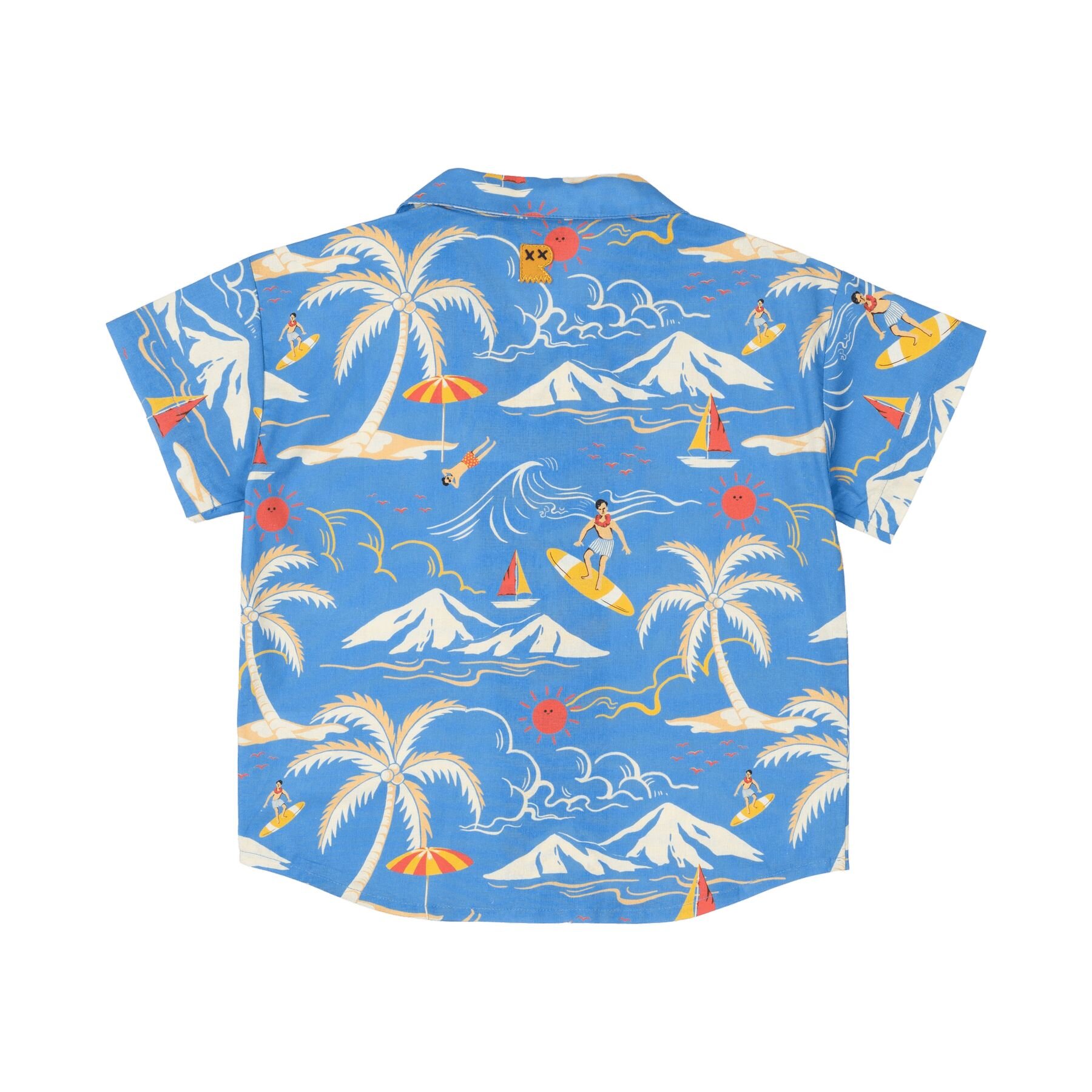 Introducing our Surfin Safari Shirt! Made from 100% woven cotton, this shirt includes a boxy fit, collar, short sleeves, red buttons, curved hem, and a blue base with beach and surf inspired graphics.