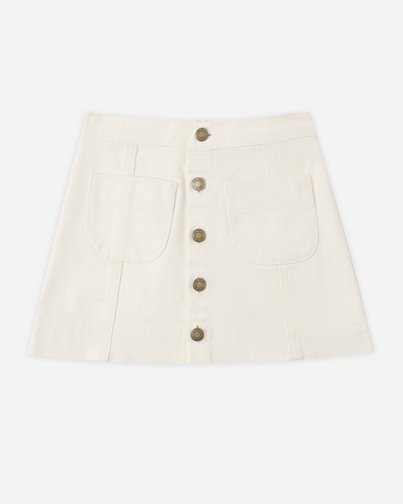 This versatile denim skirt channels preppy charm with antique brass buttons and front patch pockets accented by contrast embroidered stitching.