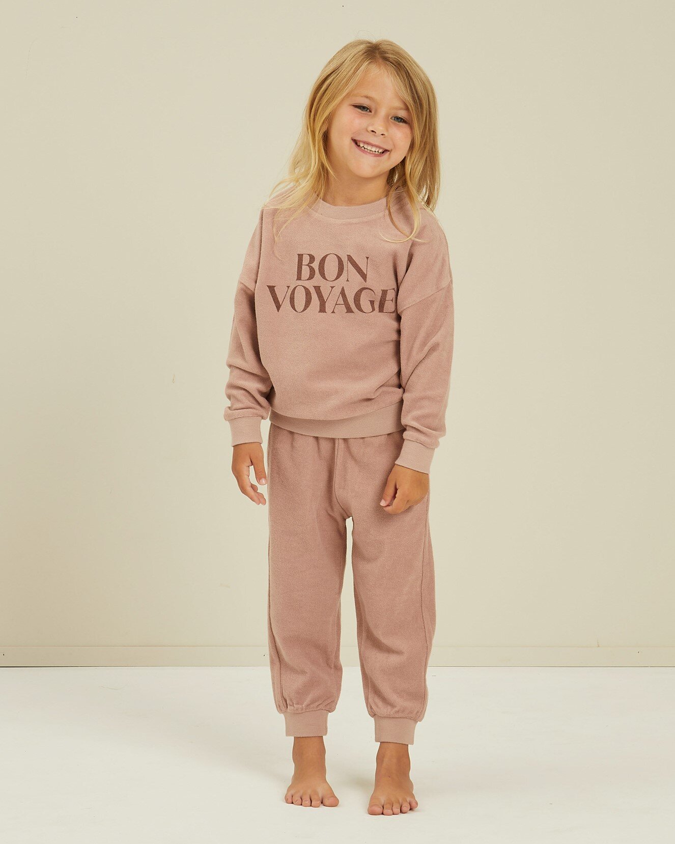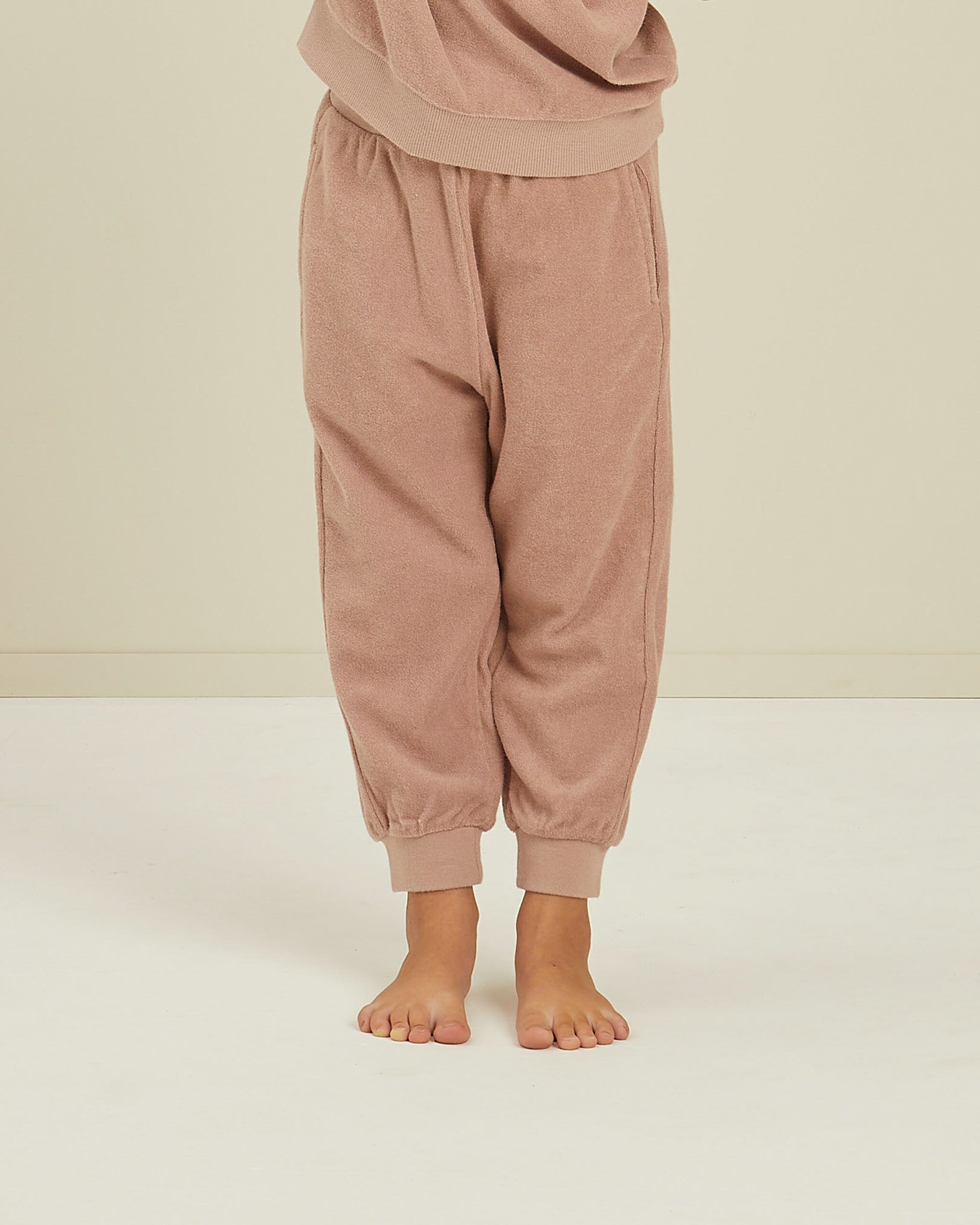 Relaxed-fit sweatpants made of the coziest terry fabric. These sweatpants include an elastic and drawstring waistband, with pockets. Color: mauve Made of 100% cotton