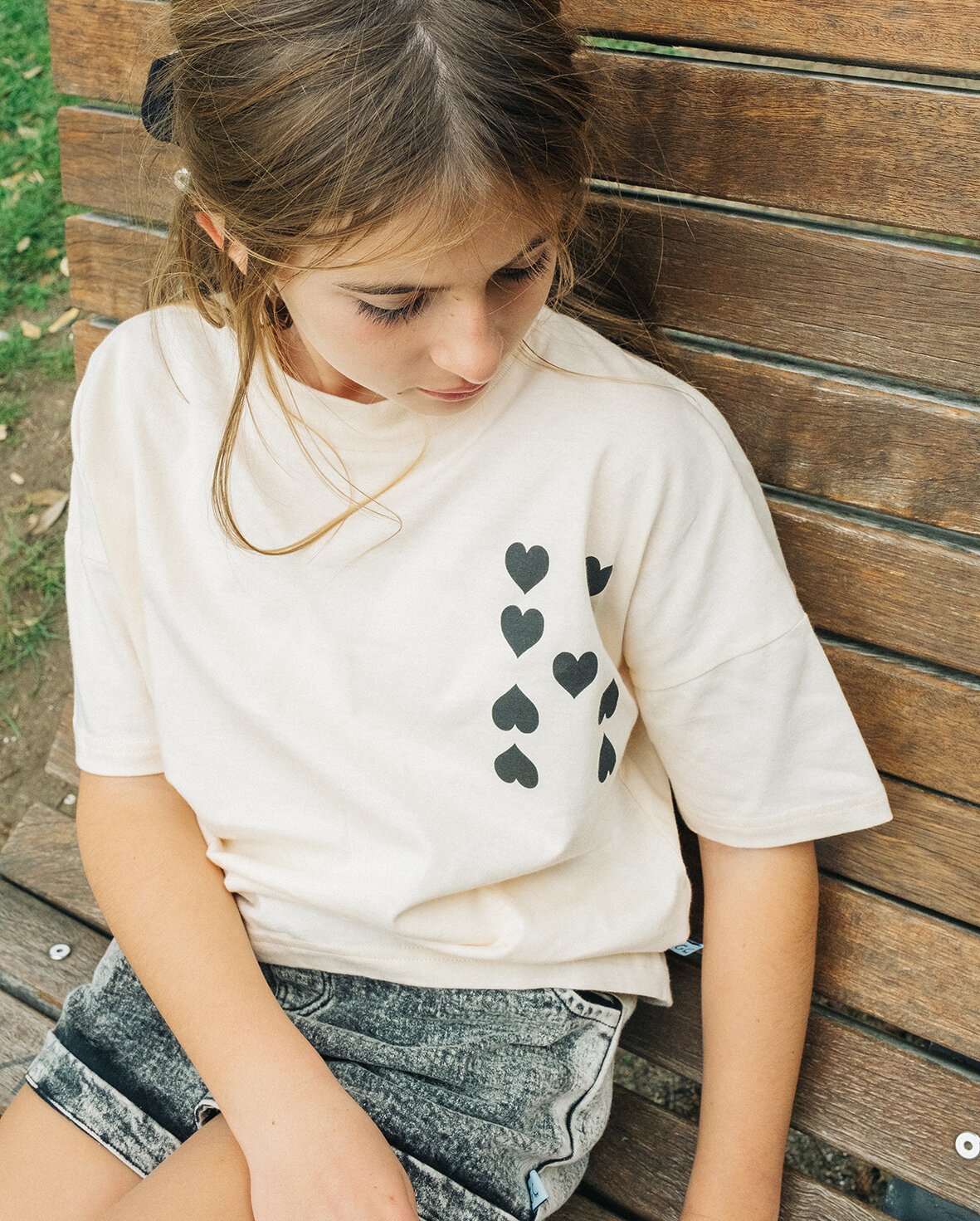 The Girl Club Nine of hearts relaxed tee has that cool statement tee vibe going on. This girls tee has a straight hem and is cut to be relaxed and easy to wear. Made of soft jersey cotton this cool tee has been made to fit true to size with a wider and relaxed fit. Models are age 10 and is wearing size 10.
