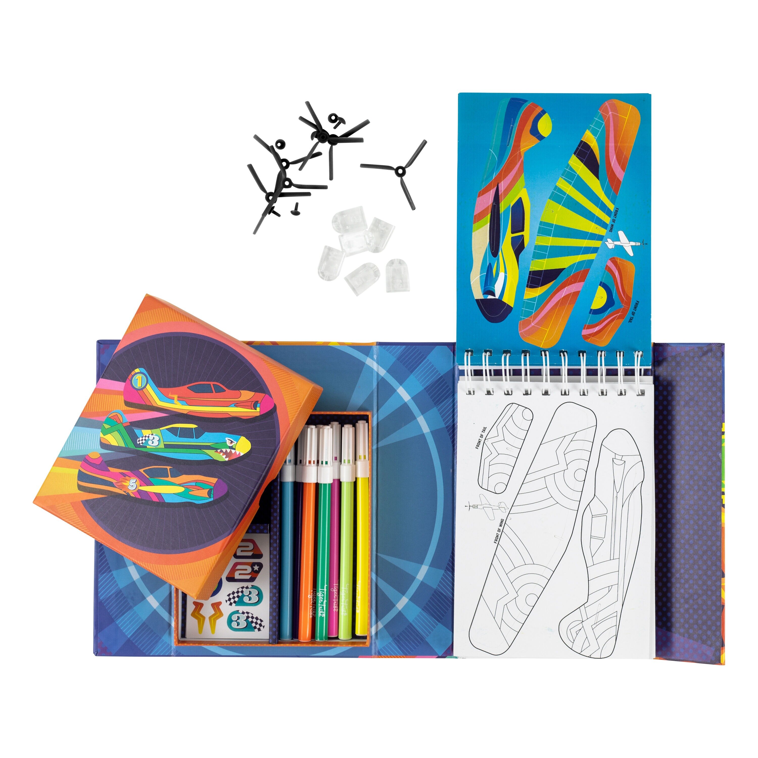 Colour, build and play with this all-in-one set ideal for aviation enthused kids. This comprehensive activity set contains pop-out planes primed for decoration with included stickers and vibrant markers. Construct the planes with propellors and aerodynamic protective nose cones to ensure a smooth flight, and the large format target sheets transition the creative activity into a fun game of skill.