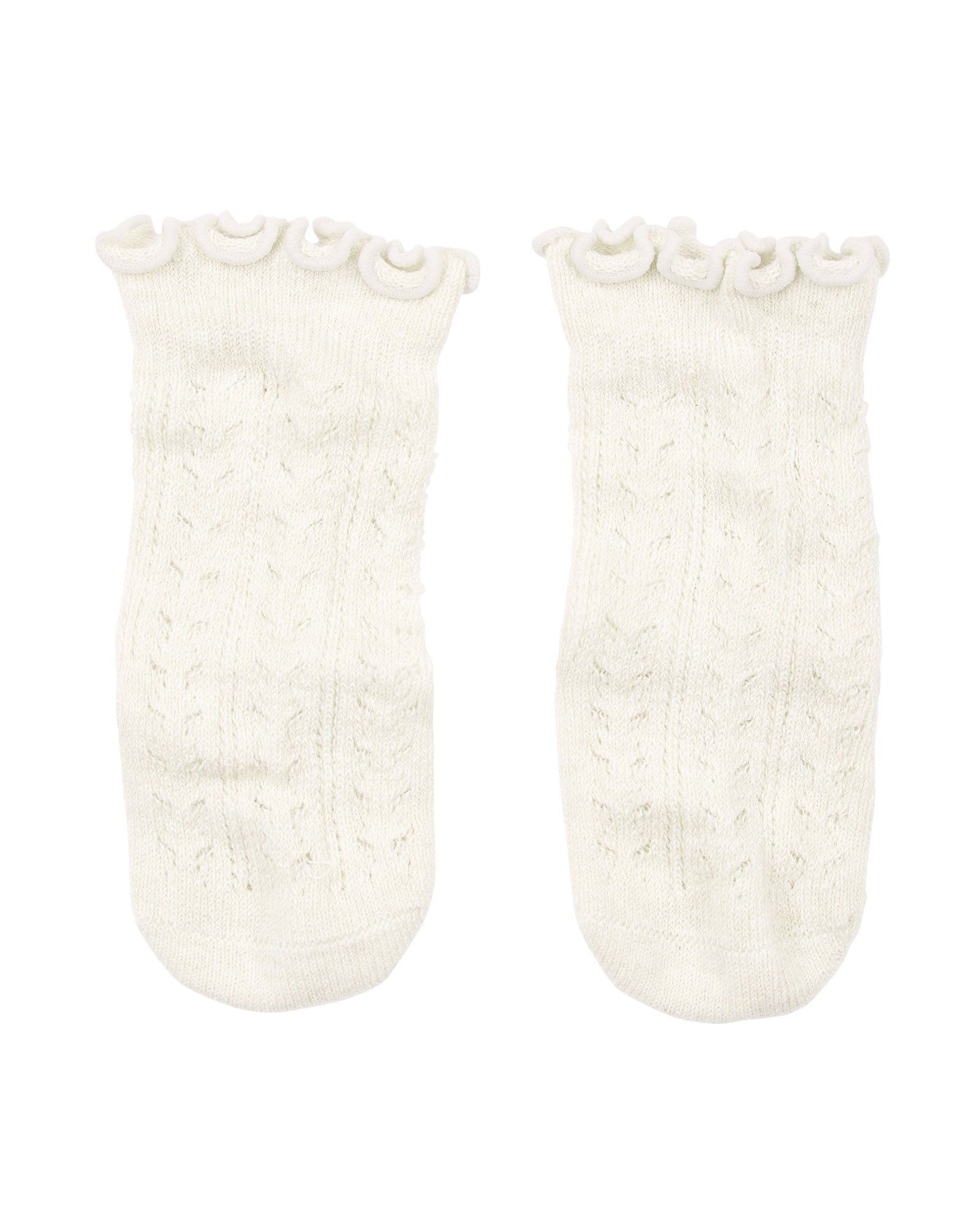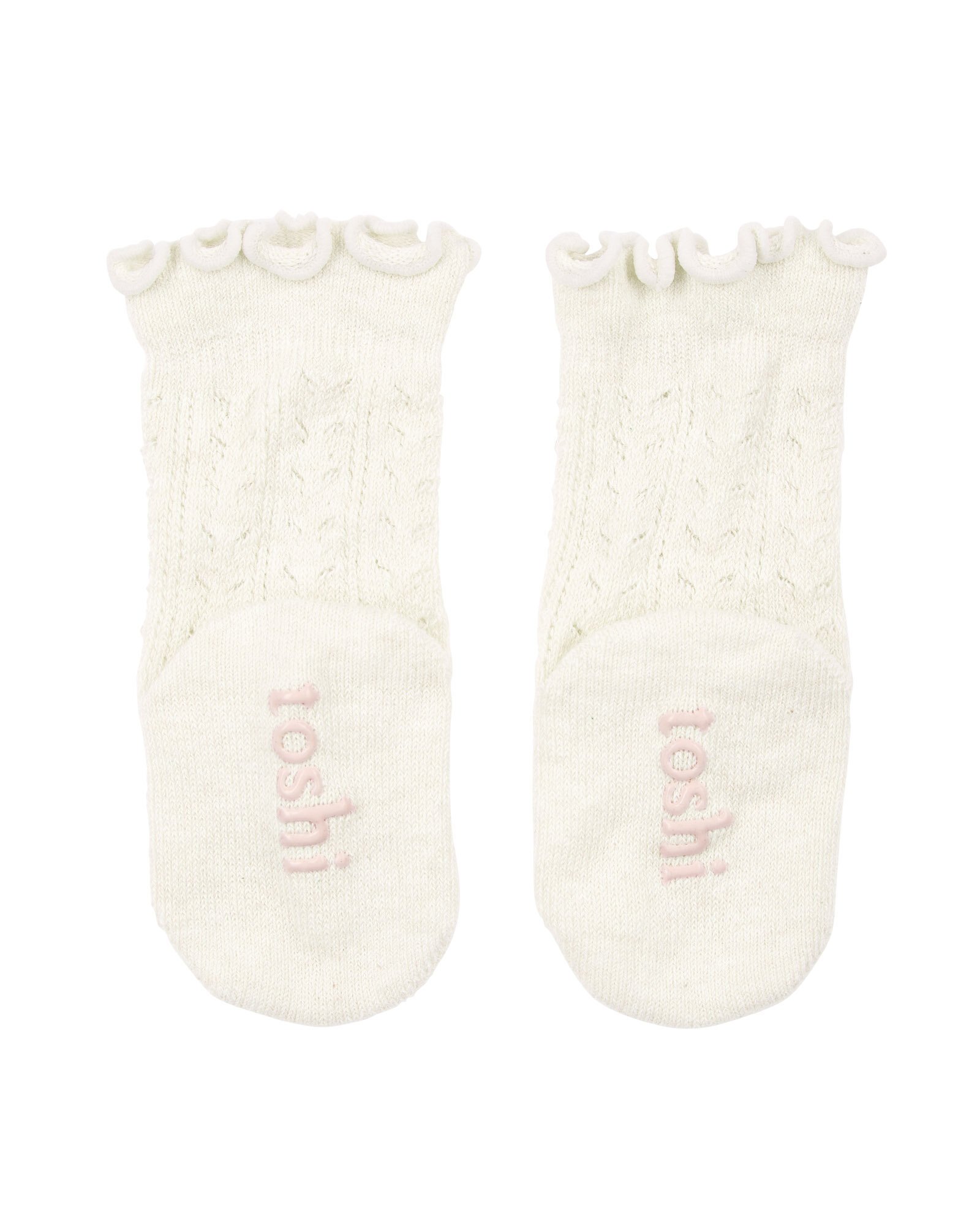 Toshi Organic Socks Knee Frilly Lace Cream keep toddler feet warm and protected on everyday outdoor walks and cooler days. A knee high sock that stays cozy for playtime in changing weather.