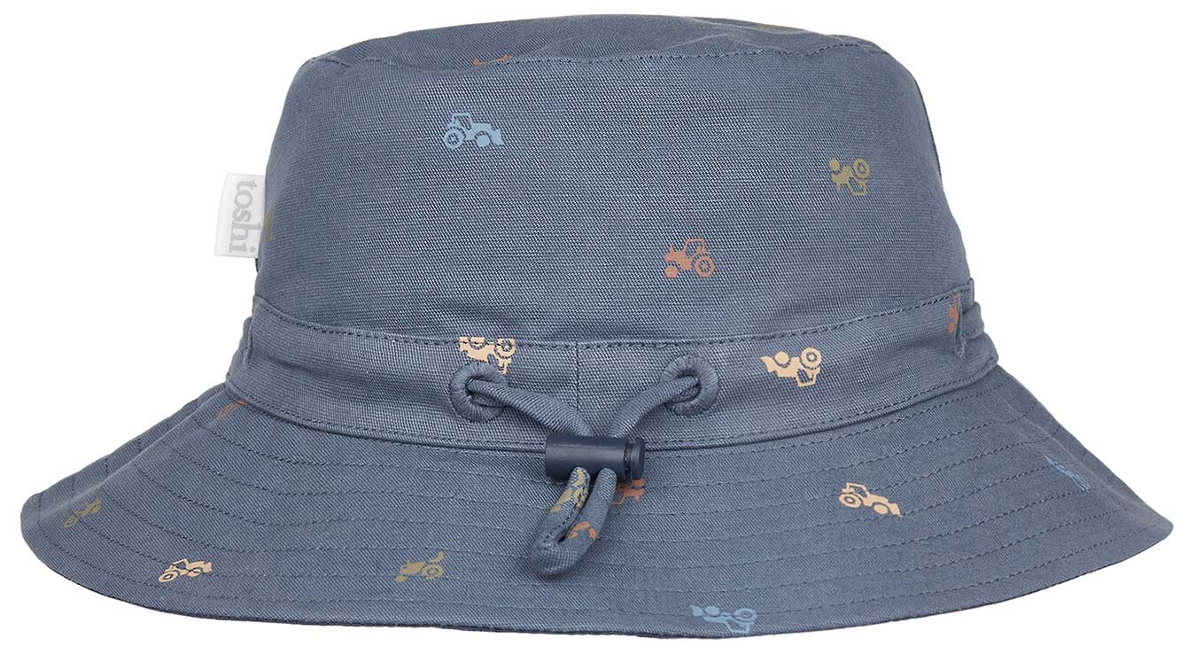Toshi presents Sunhat Drifter, an ideal sunhat for children of all ages. The broad and well-structured brim offers increased sun protection. A head toggle creates adjustable sizing and the chin tie with toggle secures the hat and offers ease of wear. The security release clasp on the chin tie is designed to enhance wearer safety. Sunhat Drifter is crafted from the finest quality and high durability cotton and is fully lined for additional comfort. Sunhat Drifter Tractor presents in an original and exclusive Toshi design, featuring farmyard tractors in a classic and timeless navy blue hue. Style Sunhat Drifter Tractor with a Toshi 100% organic cotton Dreamtime Tee, a pair of Baby Bloomers and Bandana Bib and take a road trip in your favourite wheels!