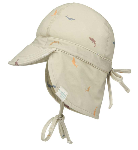 The beauty, functionality and elevated quality for which Toshi is traditionally renowned, is crafted into an exquisite baby swimwear collection. Rated UPF50+, Toshi Swim offers maximised sun protection and water safety. The finest quality fabrication is fast drying, chlorine and salt water friendly. The classic Flap Cap features a contoured neck flap for enhanced sun protection, head tie for adjustable sizing and chin tie to secure the hat. Most importantly, the classic flap cap has a well structured brim that maintains shape when wet. Toshi Swim Flap Cap Shark Tank features an original and exclusive Toshi print design, the big predators of the deep oceans are presented in a gender-neutral khaki hue. Style Toshi Swim Flap Cap with Swim Rashie and Swim Shorts for fun in the sun this summer!