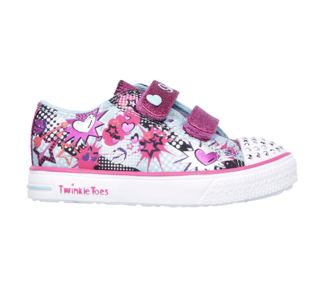 Take her to new galaxies in style with the SKECHERS Twinkle Toes: Shuffles - Comet Cutie shoe. Soft woven canvas fabric and glitter finish fabric upper in a three strap closure light up casual sneaker with fun ombre star print and on/off switch feature. Air-Cooled Memory Foam insole.Colorful lights on toe cap light up and blink with every step!
